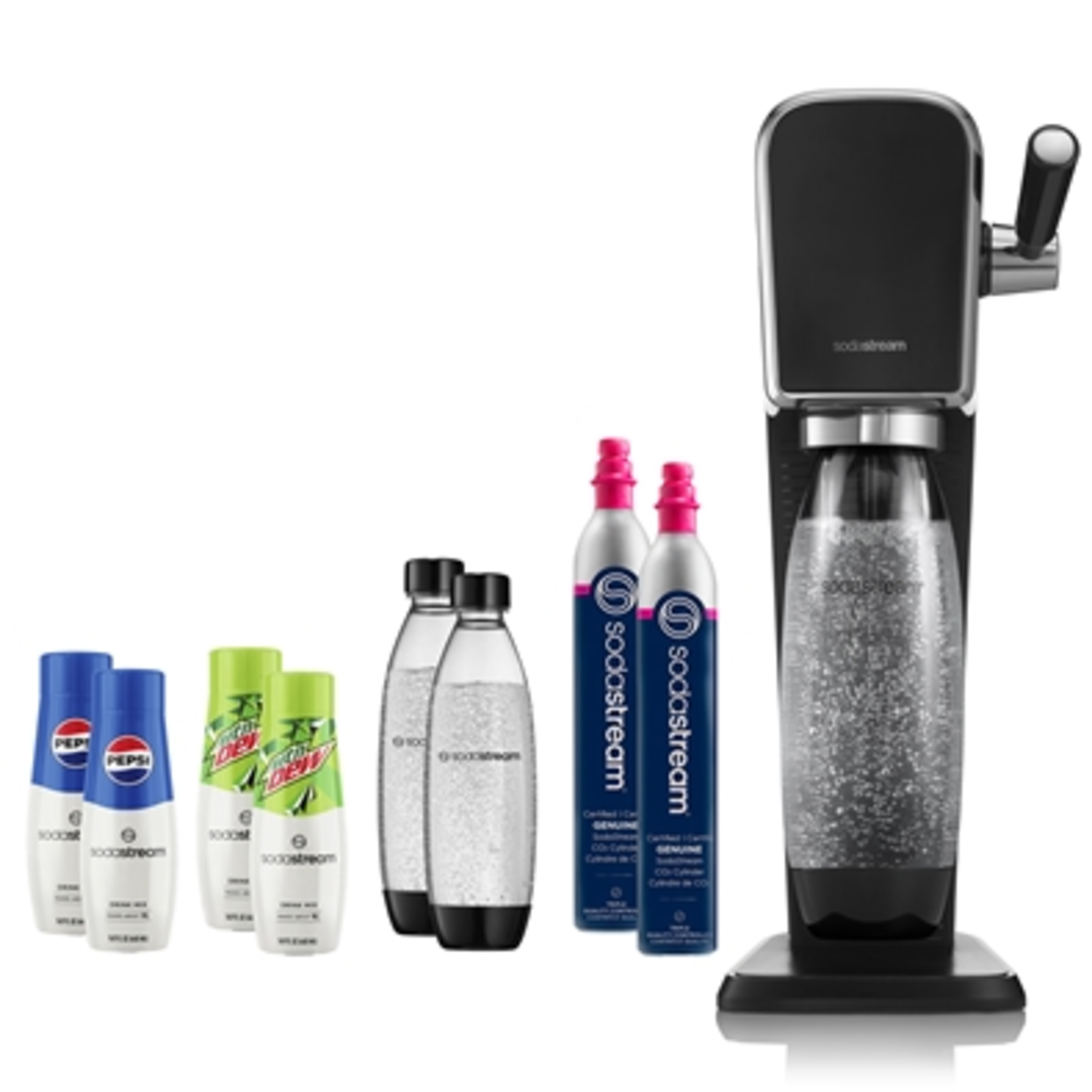 The SodaStream Art sparkling water maker celebrates the art of making your own fresh sparkling beverages at home. With a push of the lever, turn flat water into fresh sparkling water and customize to your liking. The SodaStream Art features a retro looking design along with a unique carbonating lever. Kit Comes With 2 Co2 Cylinders, Carbonations Bottles, And 2 Bottles Of Syrup