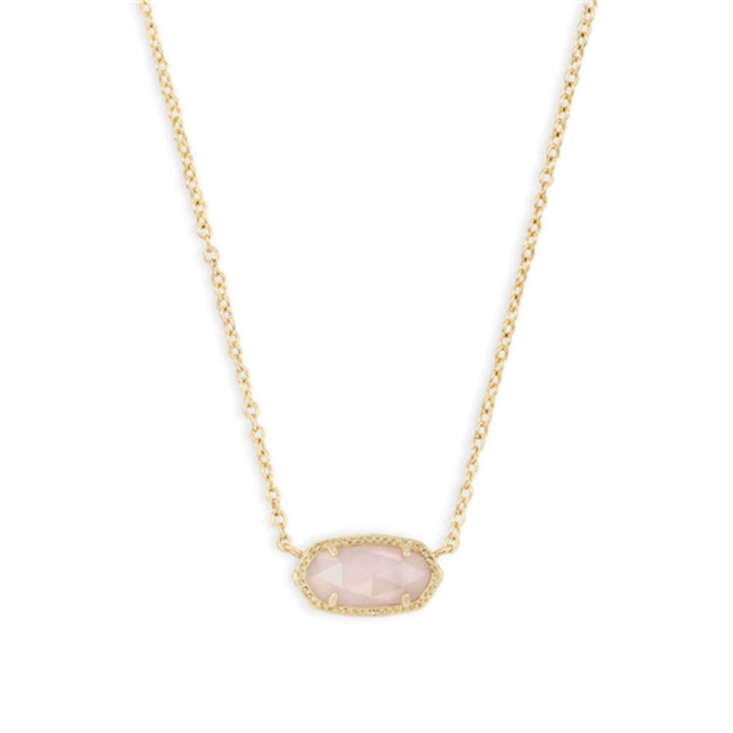 A dainty stone and delicate metallic chain combine to create the Elisa Pendant Necklace in Rose Quartz, your new favorite wear-anywhere accessory. This pendant necklace can be paired with any look, providing that extra touch of timeless style. Make the Elisa Rose Quartz Necklace a staple in your wardrobe and you will not be disappointed. 14K Gold Plated Over Brass. Size: 0.63"L x 0.38"W stationary pendant, 15" chain with 2" extender. Lobster claw closure, Material: Rose quartz.