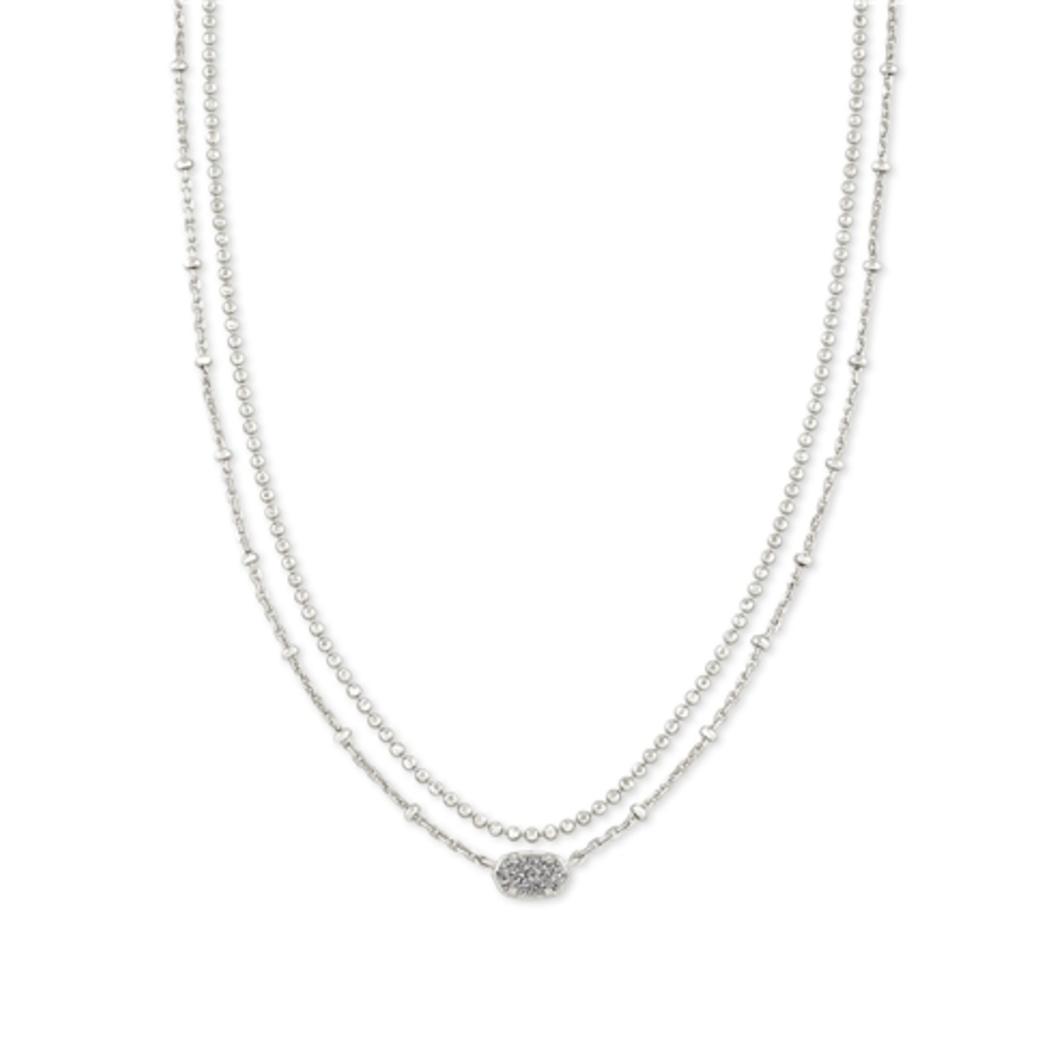 Pull off an effortlessly layered look in the Kendra Scott Emilie Multi-Strand Necklace in Platinum-Tone Drusy. Mini versions of Kendra Scott's most iconic silhouettes and delicate chains put us in the freshly-showered-sun-soaked-warm-kind of mood. This rhodium-plated brass necklace measures 15.5 inches in length with a 3-inch extender.
