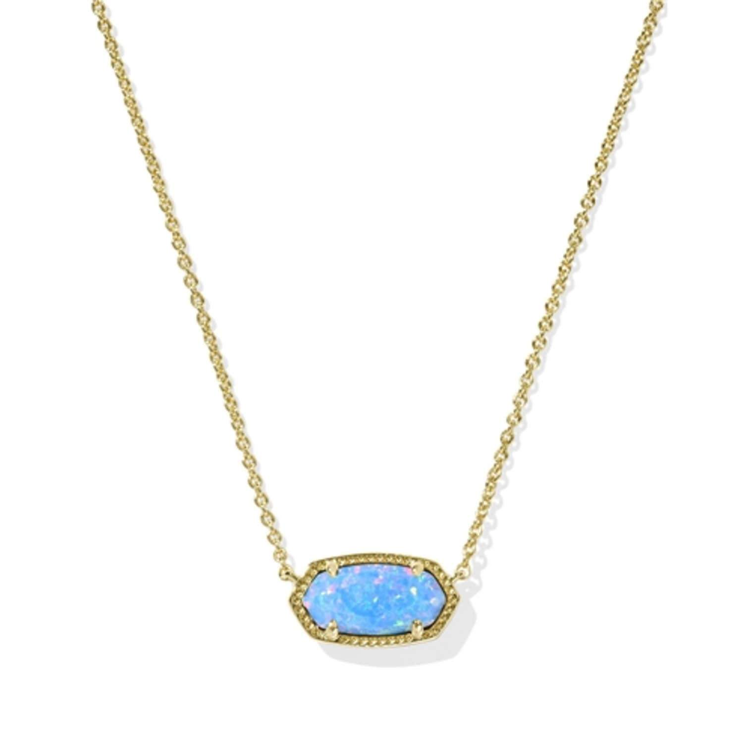 The Elisa Pendant Necklace in Periwinkle Kyocera Opal offers a dreamy splash of color on a delicate gold chain. Its soft lavender-blue hue brings a refreshing elegance to any look. Wear it layered or solo for subtle charm, with dimensions: 15" chain with 2" extender, 0.71"L x 0.38"W pendant.