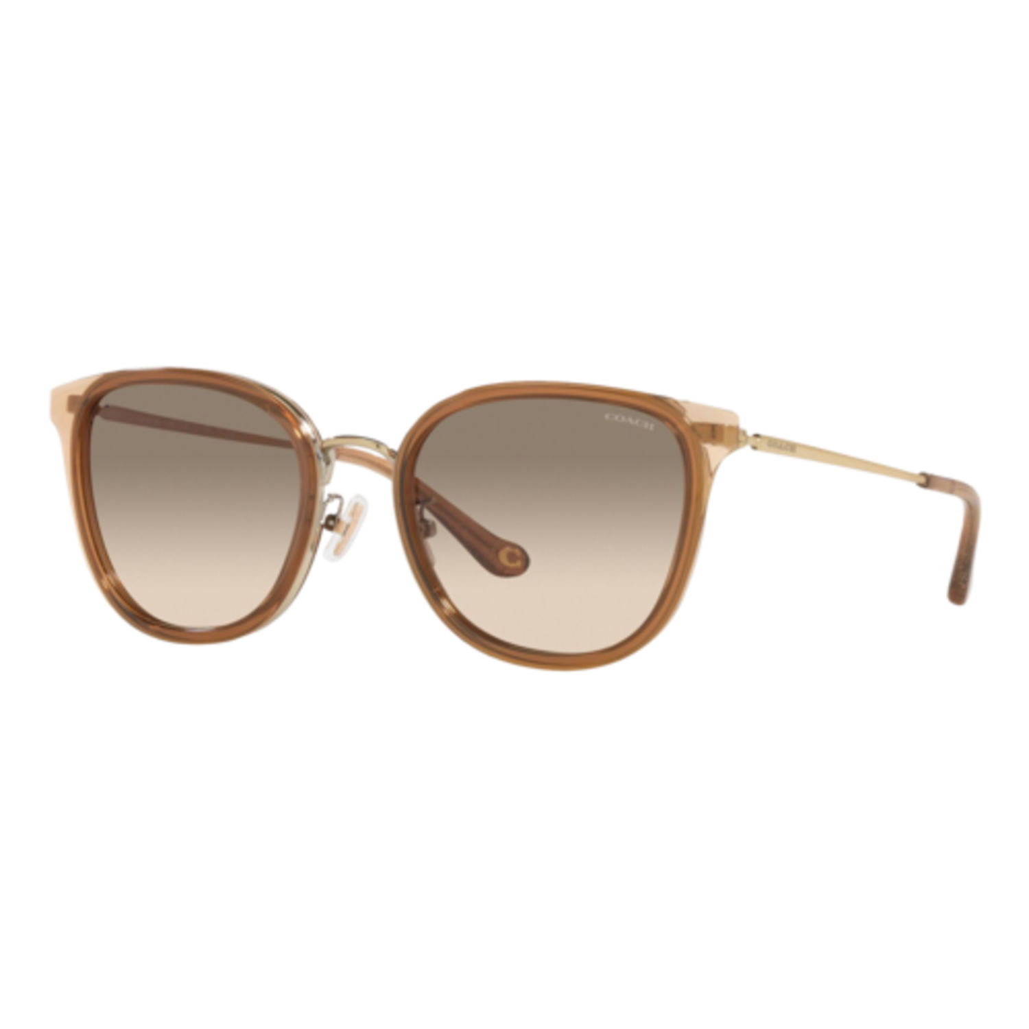 Geometric and bold, these glamorous square frames are inspired by styles from the 1970s. The dramatic style is finished with our Signature for a heritage touch. Eye size: 54; Frame: Light Gold/Brown; Lens: Light Brown Grey Gradient; Lens Material: Standard Plastic