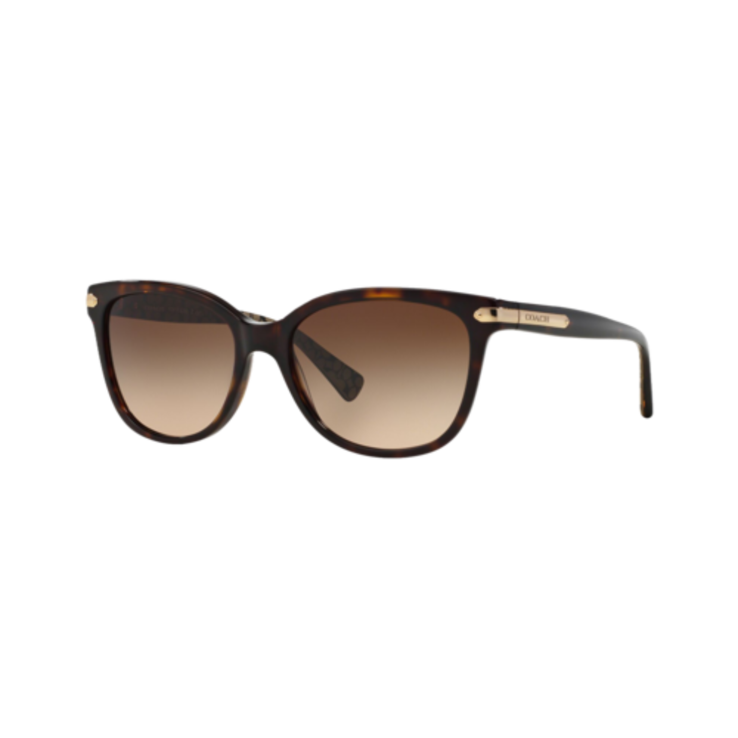 Coach is a modern luxury brand with a rich American heritage. The Tag Temple collection turns the Coach hang tag into an engraved metal plaque that wraps the hinge. Strikingly chic, these dark tortoise designer sunglasses with dark brown gradient lenses lend celeb status to the cat eye shape. Smooth temples flaunt a riveted gold logo plaque. Eye size: 57; Frame: Dark Tortoise; Lens: Dark Brown Gradient; Lens Material: Standard Plastic