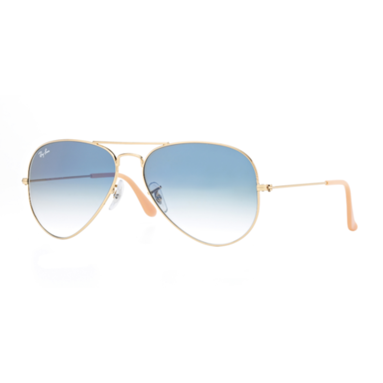 Ray-Ban Aviator Gradient sunglasses encompass the teardrop shape that started it all. Originally designed for U.S. aviators, the Aviator Sunglasses design has become an icon. The gradient lenses are nicely toned and give a cool effect to what is considered the sunglass that shaped entire cult movements. Eye size: 58; Frame: Gold; Lens: Light Blue Gradient; Lens Material: Crystal Glass