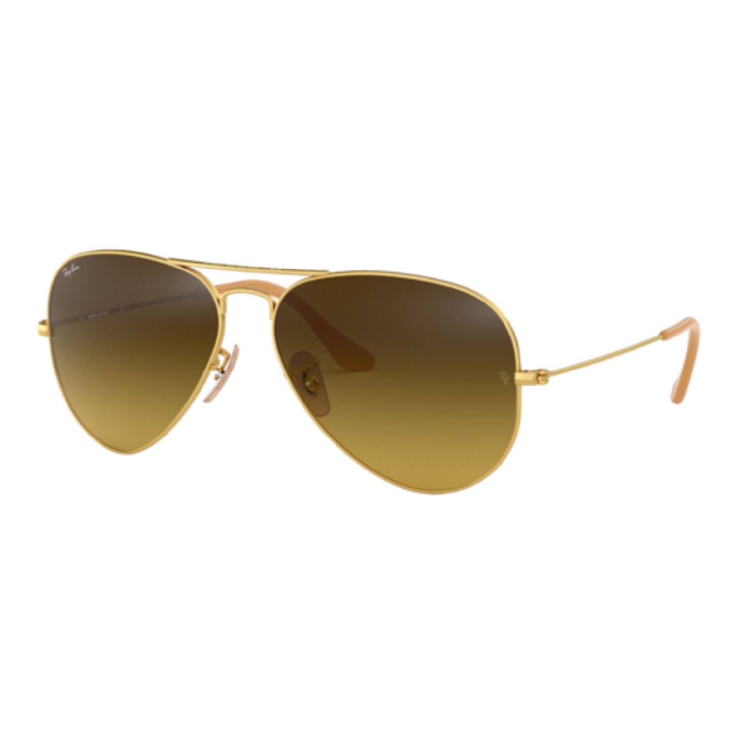 Ray-Ban Aviator Gradient sunglasses encompass the teardrop shape that started it all. Originally designed for U.S. aviators, the Aviator Sunglasses design has become an icon. The gradient lenses are nicely toned and give a cool effect to what is considered the sunglass that shaped entire cult movements. Eye size: 58; Frame: Gold; Lens: Brown Gradient; Lens Material: Crystal Glass