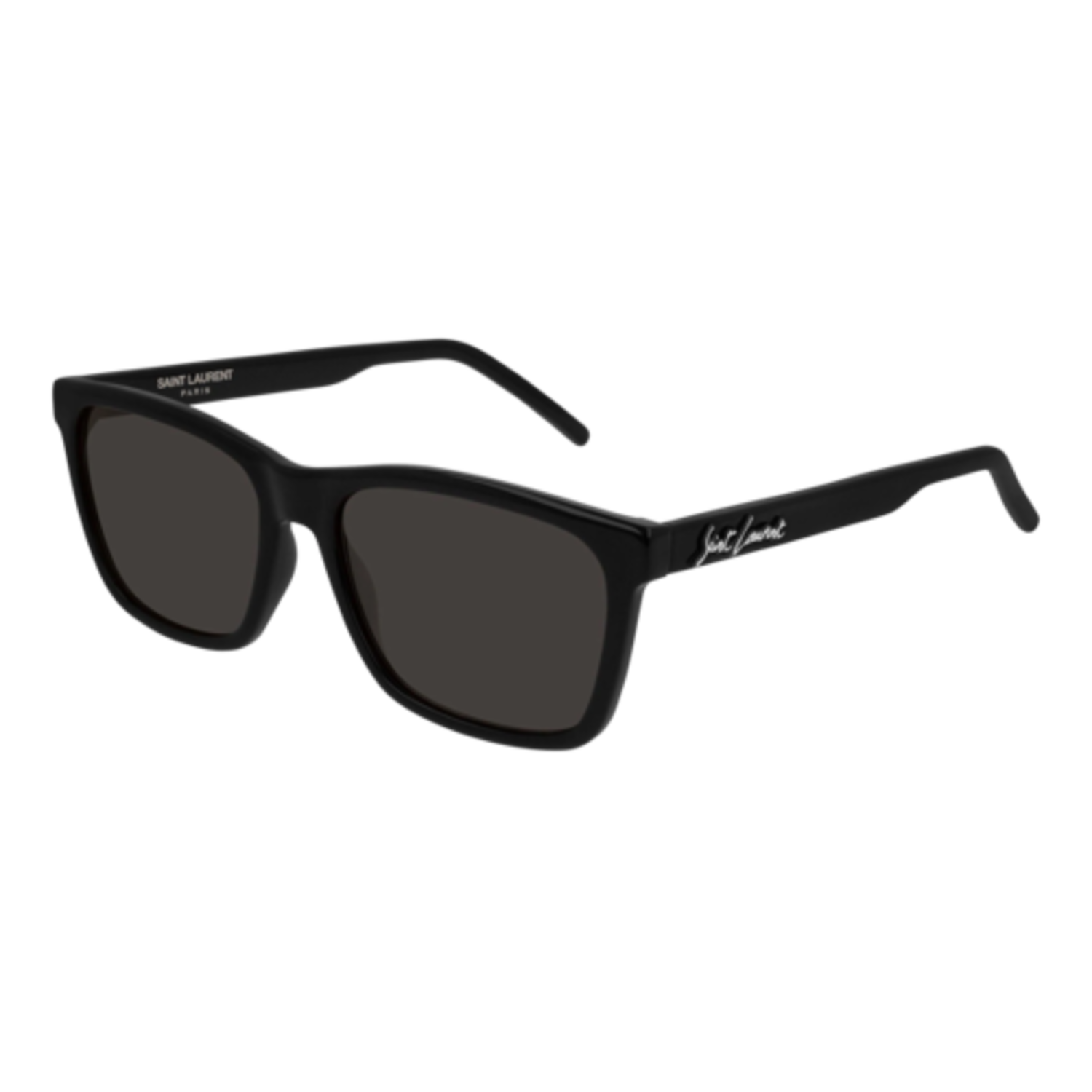 An easy-to-wear squared shape part of the new accessible and cool line, Saint Laurent Signature, featuring a new signature logo on the temples. A new material for maximum flexibility and lightness. Target: young, cool, fashion oriented, gender-less and urban clientele. Colors inspired by Saint Laurent iconic palette of Black and Havanas. Eye size: 56; Frame: Black; Lens: Black; Lens Material: Standard Plastic