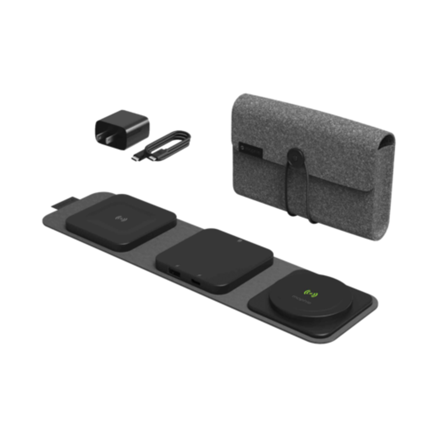 The snap+ multi-device travel charger has everything you need to charge on-the-go. Designated wireless charging spots for your phone and AirPods provide a shared output of up to 5W-15W of power. It also has a USB-C port and a USB-A port, so you can plug in two additional devices to charge. The travel charger folds neatly into a bundle that fits easily in your bag. Compatible with: AirPods, Apple Watch, iPhone, Qi-enabled Devices