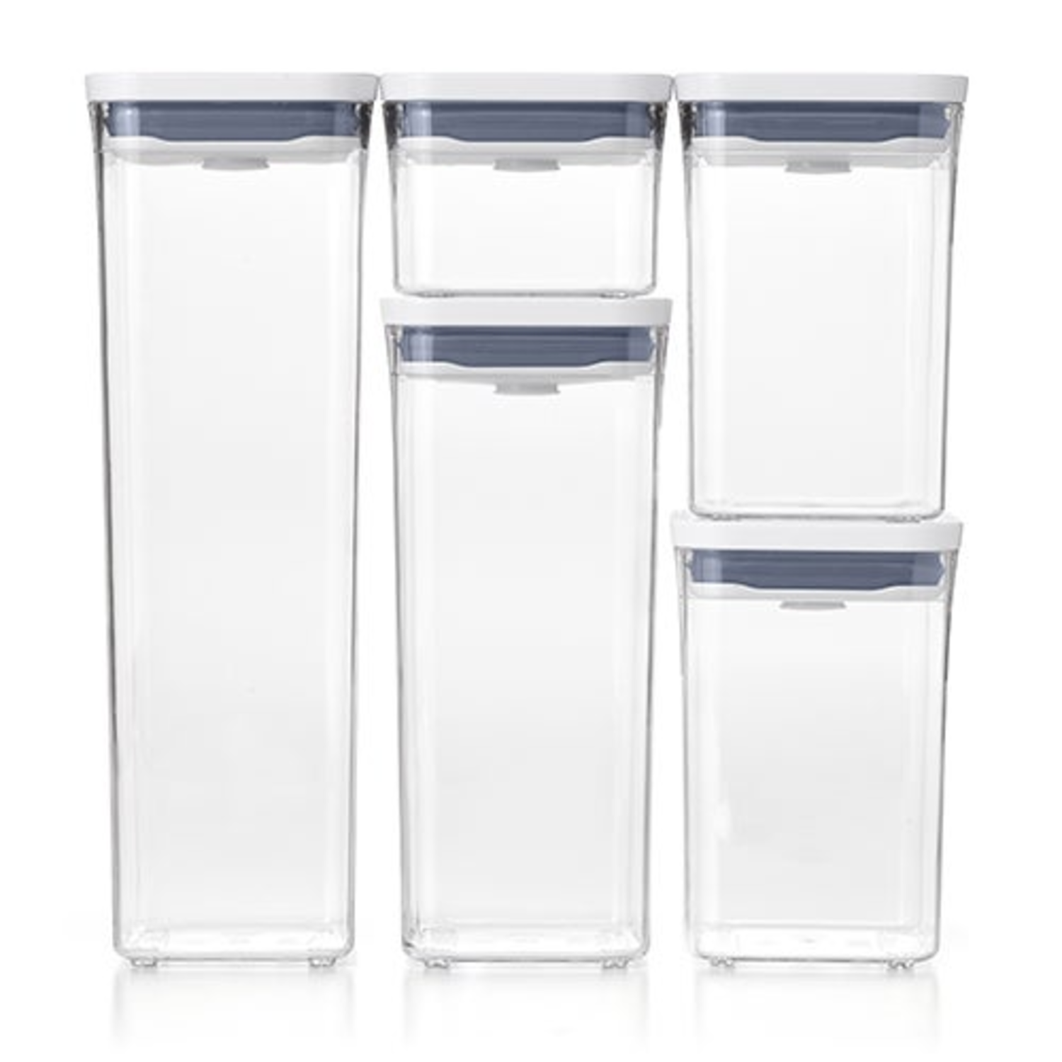 Keep your food fresh and your kitchen organized with the POP containers. Store dry foods such as flour rice tea bags sugar and more. POP Containers are stackable so they take up less space on counters. Organize in a combination to fit a counter or pantry. Push button creates an airtight seal and releases it with one touch. Corners are designed for easy pouring. BPA-free construction. Lids come apart for cleaning. Dishwasher safe. Includes: 0.4qt Container. Two 1.1qt Container. 1.7qt Container. .3qt Container.