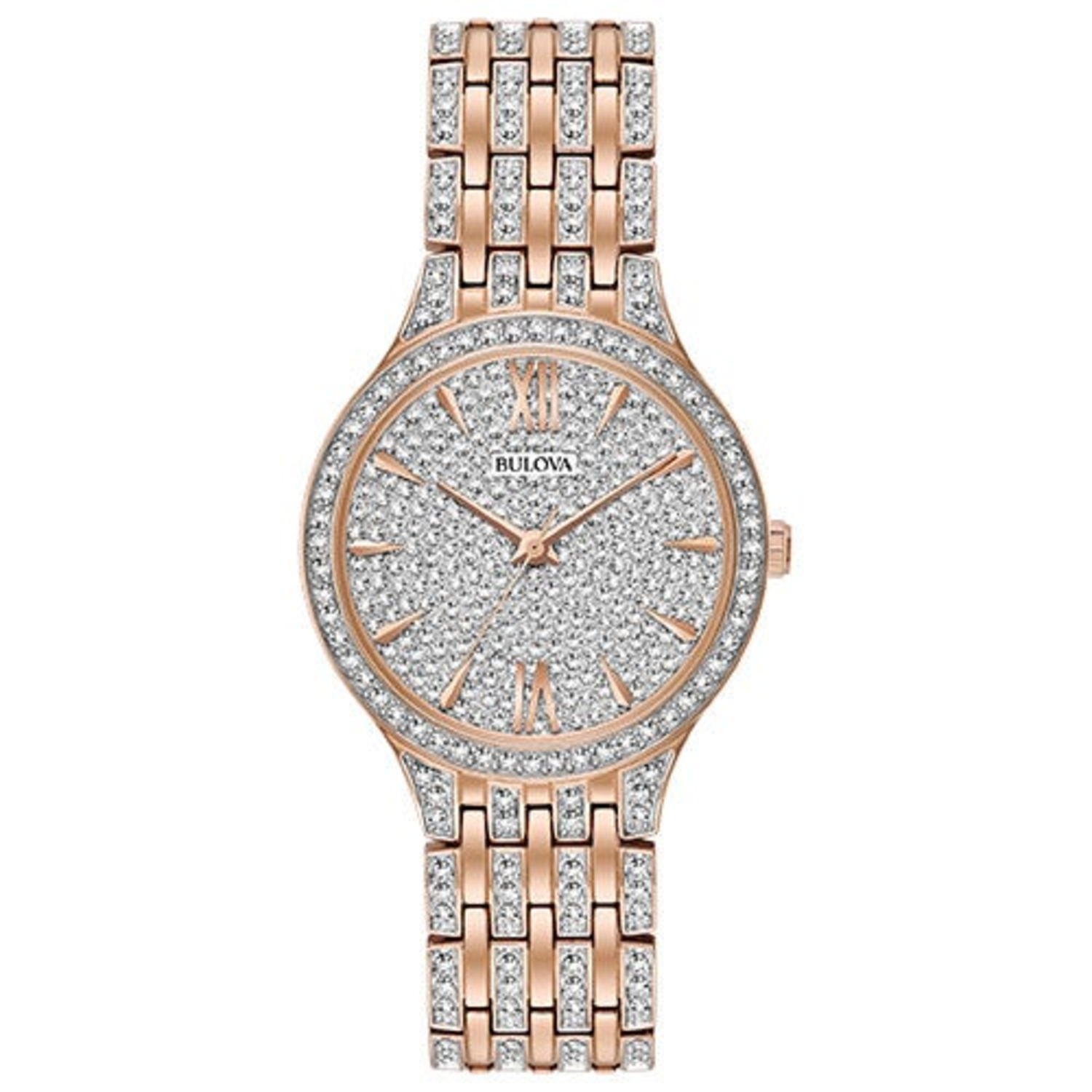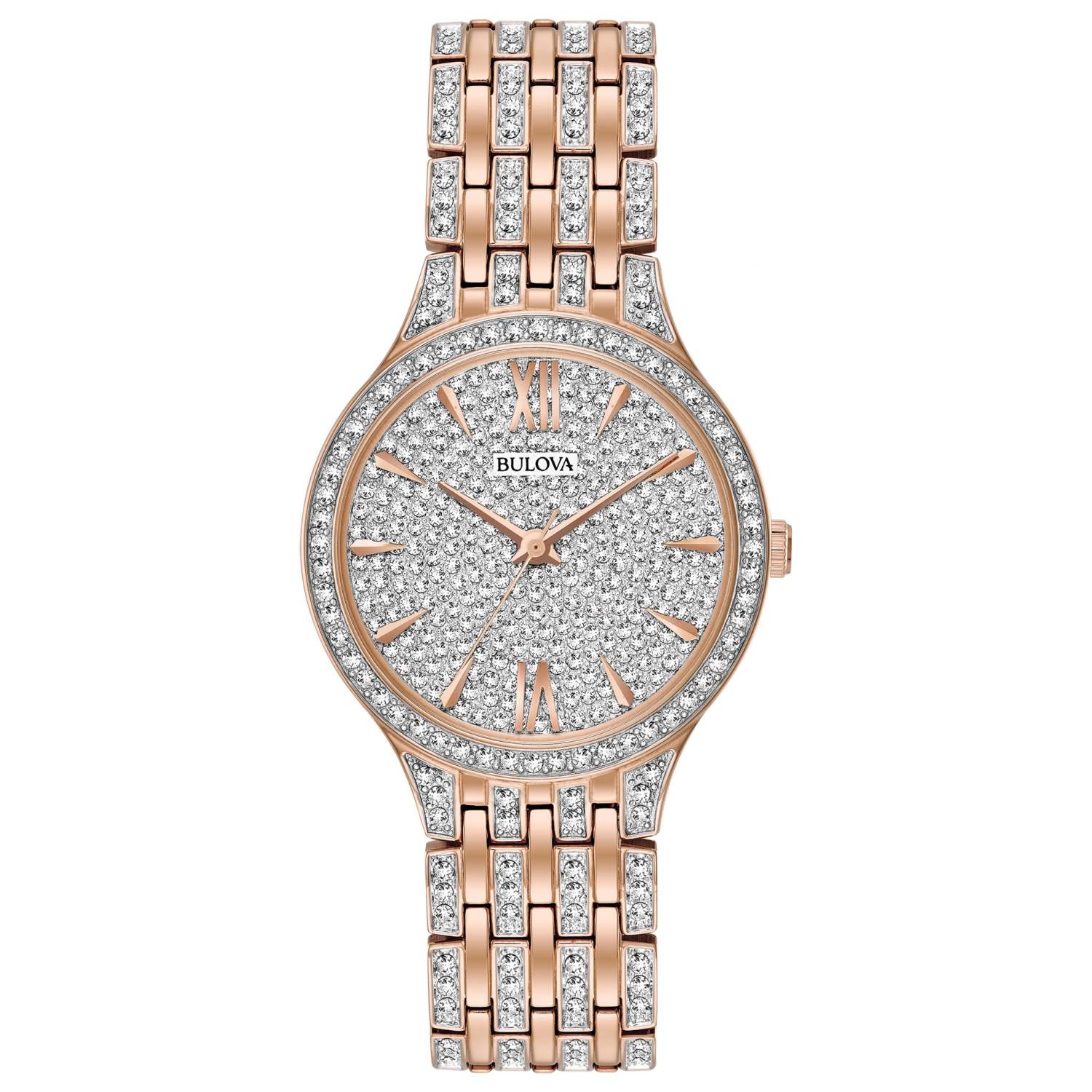 Phantom is for the bold and daring from the Crystal Collection. Rose gold-tone stainless steel bracelet and crystal detail. Crystal paved dial with rose gold hour markers Roman numerals and three hands. Rose gold-tone bezel is fully paved with sparkling crystals. Mineral crystal dial window. Deployant closure. Lug width: 16mm. Case size: 32mm. Water resistant to 30 M. 3-Year manufacturer limited warranty. Water resistant to 30 M.