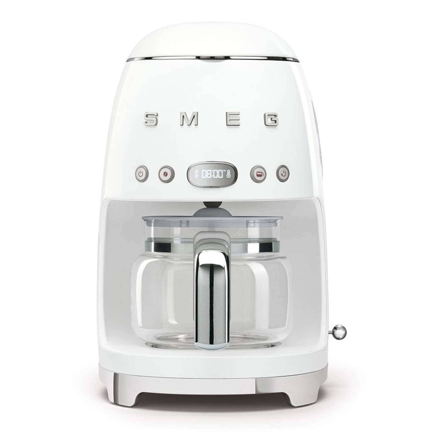 Brews deliciously aromatic richly-flavored coffee. Aroma intensity selector for light or intense. Digital LED display with clock and timer. Auto start function sets a programmable start time. Brews up to 10 cups in the glass carafe. 4 Cup functions for when smaller quantity coffee is needed. Keep warm function keeps pot warm up to 60 minutes. No-drip system. Decalcification alarm. Water tank capacity: 1.4-Liter. Anti-slip base. Power: 120V 60Hz 1050W. Dimensions: 9.625"W x 14.25"H x 10.0625"D.