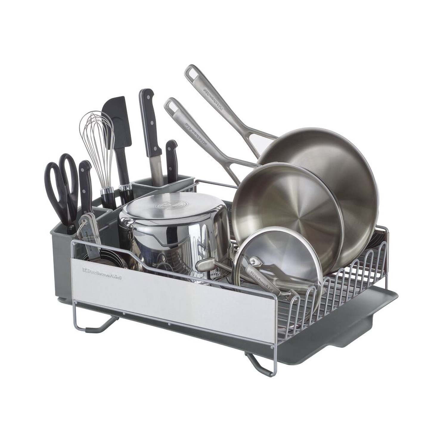 This large capacity dish rack offers function and convenience. Designed to drain over any sink or atop a drying mat on the counter. Handles plates bowls cups or full sized pots and pans. Made of heavy-duty satin coated stainless steel. Rust resistant wires secure items. Soft feet keeps rack from scratching surfaces. Features removable draining board. Removable flatware caddy with adjustable compartments. Dishes pictured NOT included.
