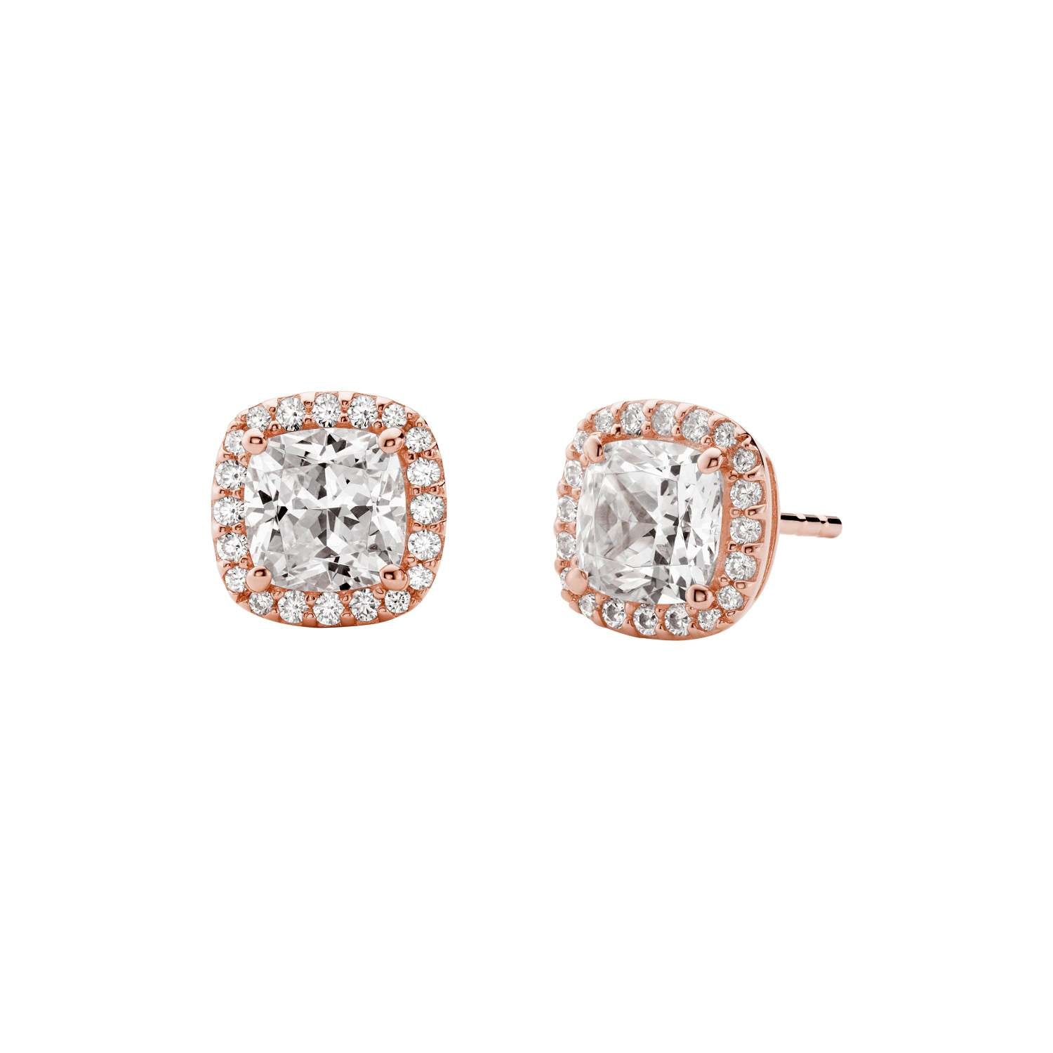 These stud earrings channel refined glamour and are perfect for everyday. Crafted from sterling silver with 14k rose gold plating. Cubic Zirconia center gem surrounded by Cubic Zirconia pave. Post/clutch backing - for pierced ears only. Measure 0.35" wide.