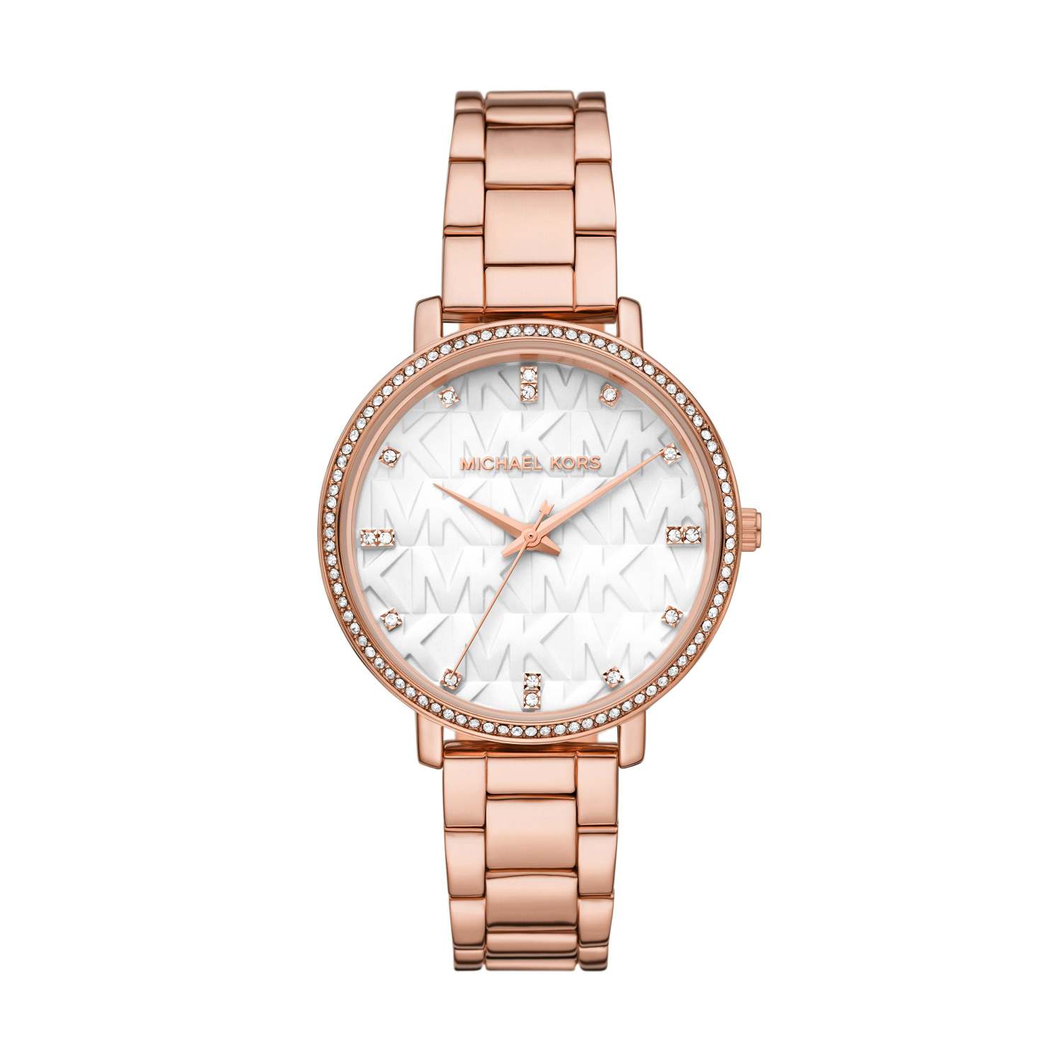 Pyper watches are the definition of everyday elegance. Rose gold-tone stainless steel bracelet case and bezel. White MK stamped dial with crystal hour markers. Three rose gold-tone hands. Bezel fully paved with sparkling crystals. Double push button fold over closure. Bracelet width: 16mm. Case size: 38mm. Water resistant to 30 M.