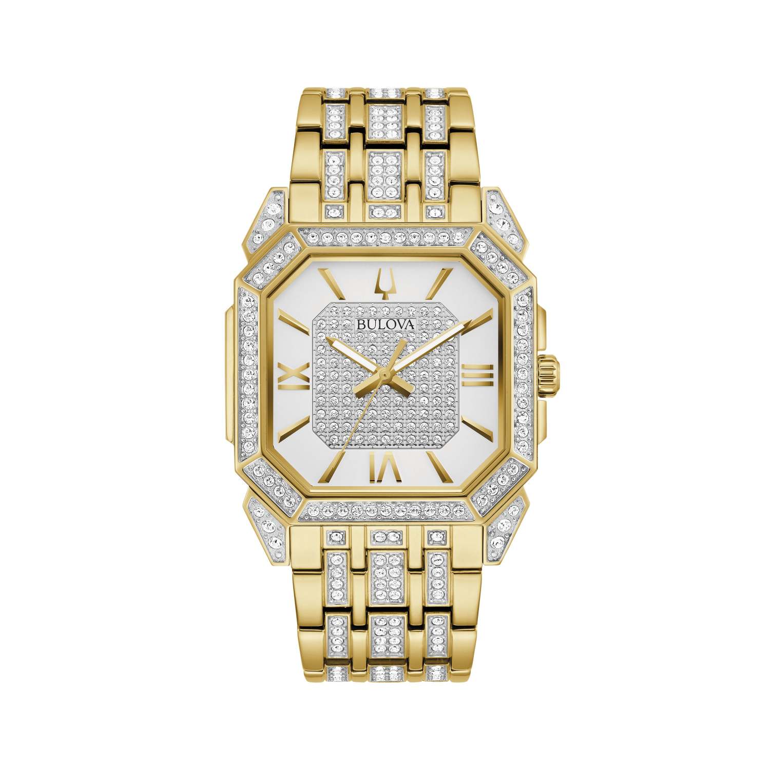 Octava Crystal collection offers brilliant style and contemporary appeal. Features 300 sparkling hand-set crystals to complete the bold look. Gold-tone stainless steel bracelet paved in sparkling crystals. White dial with paved crystal octagon center gold hour indices and Roman numerals. Octagon stainless steel bezel with crystal paving. Gold-tone luminous three hands. Mineral crystal dial window is impact and shatter resistant. Push button deployant closure. Lug width: 24mm. Case size: 40mm. Water resistant to 30 M.