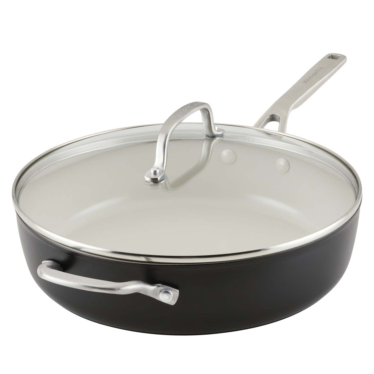 This hard anodized ceramic saute pan is finished with a contemporary design. This large saute pan is ideal for on pan recipes and family meals. Hard anodized construction is 8x harder than aluminum. Thick forged base supports fast and even heat conduction. High performance ceramic nonstick releases food easily. Nonstick is free of PFAS BPA lead and cadmium. Shatter resistant tempered lid lock in heat and moisture. Double-riveted stainless steel handle. Oven safe up to 500F - lid up to 350F. Not induction safe. Recommend hand wash only.