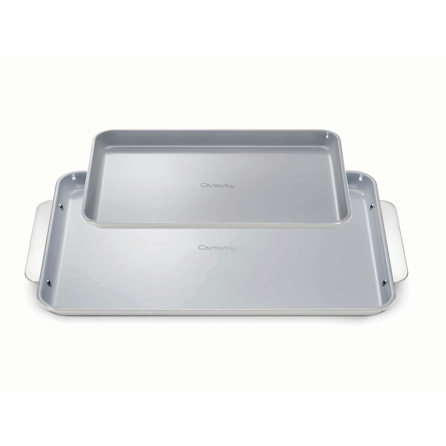 Ready Set Bake - Caraway has made it easier and safer for you. The Baking Sheet Duo is great for baking cookies to roasting vegetables. Super slick nonstick requires less oil or butter for cooking. Nonstick supports minimal scrubbing for a spotless clean. Coating is free of PTFE PFOA PFAS heavy metals and hard anodization. Surface heats consistently without any hot spots. Handles on large sheet for easy carrying. Aluminized steel body. Oven safe up to 550F. Recommend hand wash. Includes: 15" x 10" Medium baking sheet. 18" x 13" Large baking sheet.