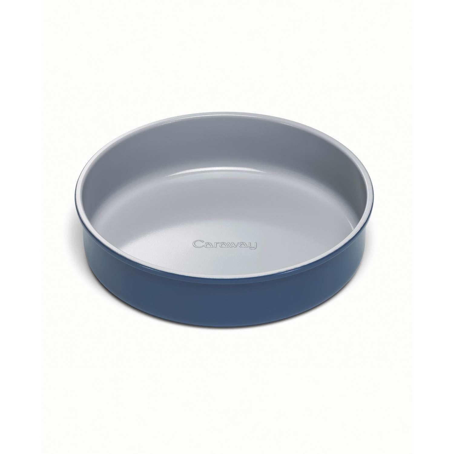 Ready Set Bake - Caraway has made it easier and safer for you. This circle pan is ideal for cakes tartes pies and more. Super slick nonstick requires less oil or butter for cooking. Nonstick supports minimal scrubbing for a spotless clean. Coating is free of PTFE PFOA PFAS heavy metals and hard anodization. Surface heats consistently without any hot spots. Details and color spark joy in your kitchen and complement any home. Aluminized steel body. Oven safe up to 550F. Recommend hand wash. 9" Diameter.