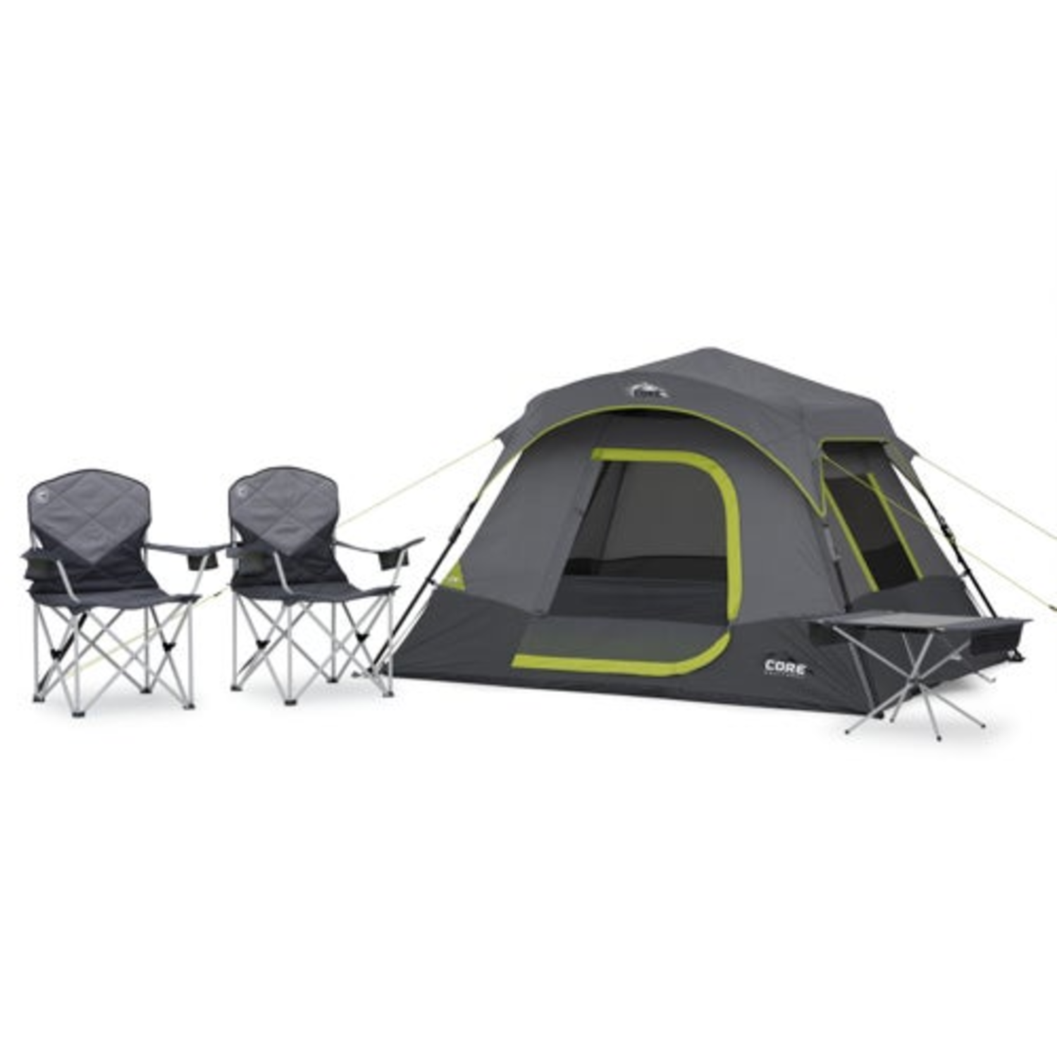 Tent body with pre-attached poles sets up in 60-seconds. H20 Block Technology - water repellent fabrics with fully taped rainfly. Lower air intake vents and mesh ceiling. Camp chairs features powder-coated steel frame. Quilted fill with 600D padded polyester outer fabric. Cup holders with elastic divider. Outdoor table features gear loft and hanging storage pockets. Tent sleeps 4 people or 2 people + gear. Chair has 300lb weight capacity. Table has 50lb weight capacity. Includes: 4 Person Instant Cabin Tent. Outdoor Table. (2) Padded Quad Chairs.
