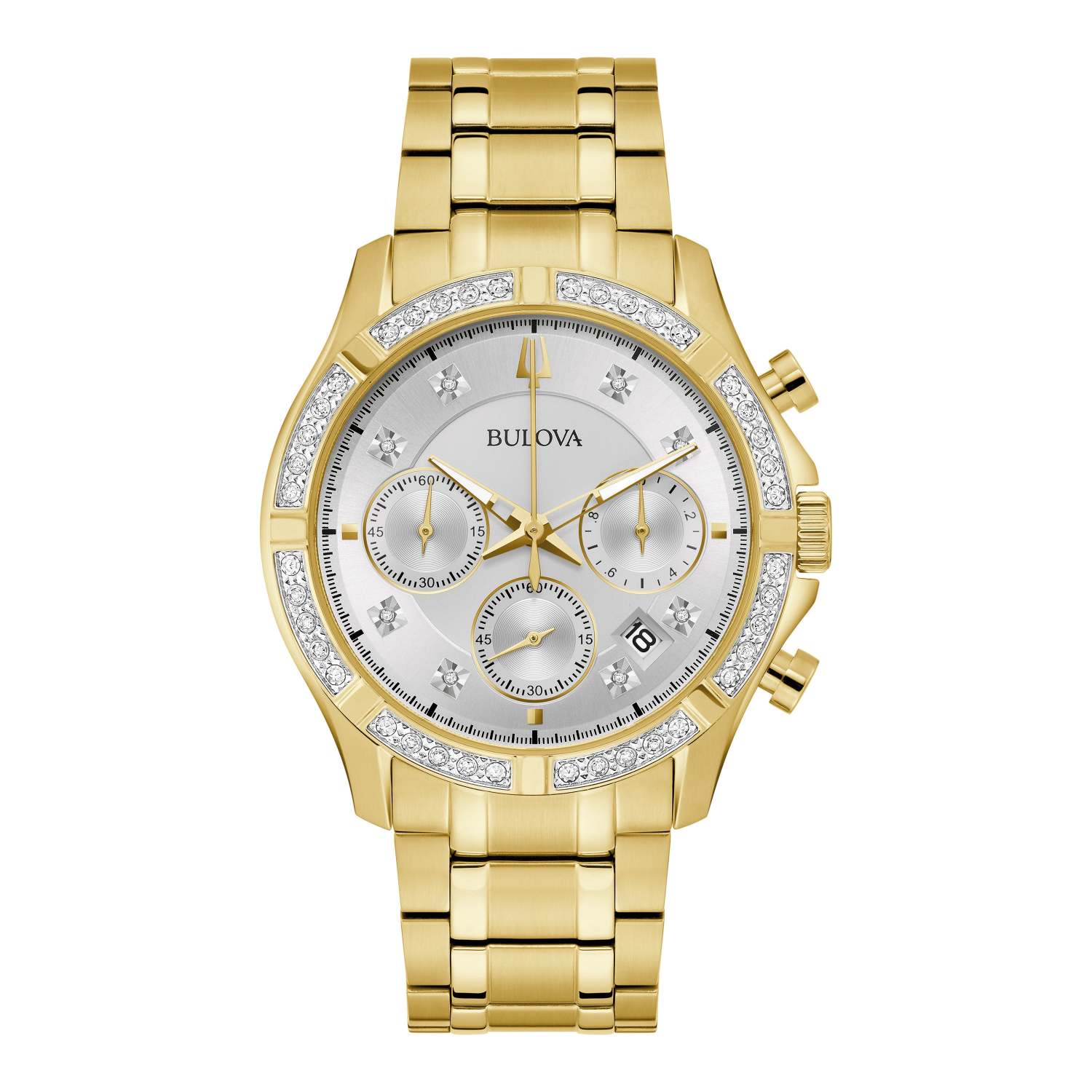 Classic Diamond watches are designed for the luxurious lifestyle. Gold-tone stainless steel bracelet bezel and case. Silver Dial with diamond hour markers and three gold hands. Chronograph dial shows seconds minutes and 1/20th of a second. Bezel is lined with dazzling diamonds. Minute markers along the outer dial rim. Mineral crystal dial window. Double push button deployant closure. Lug width: 22mm. Case size: 42mm. Water resistant to 30 M.