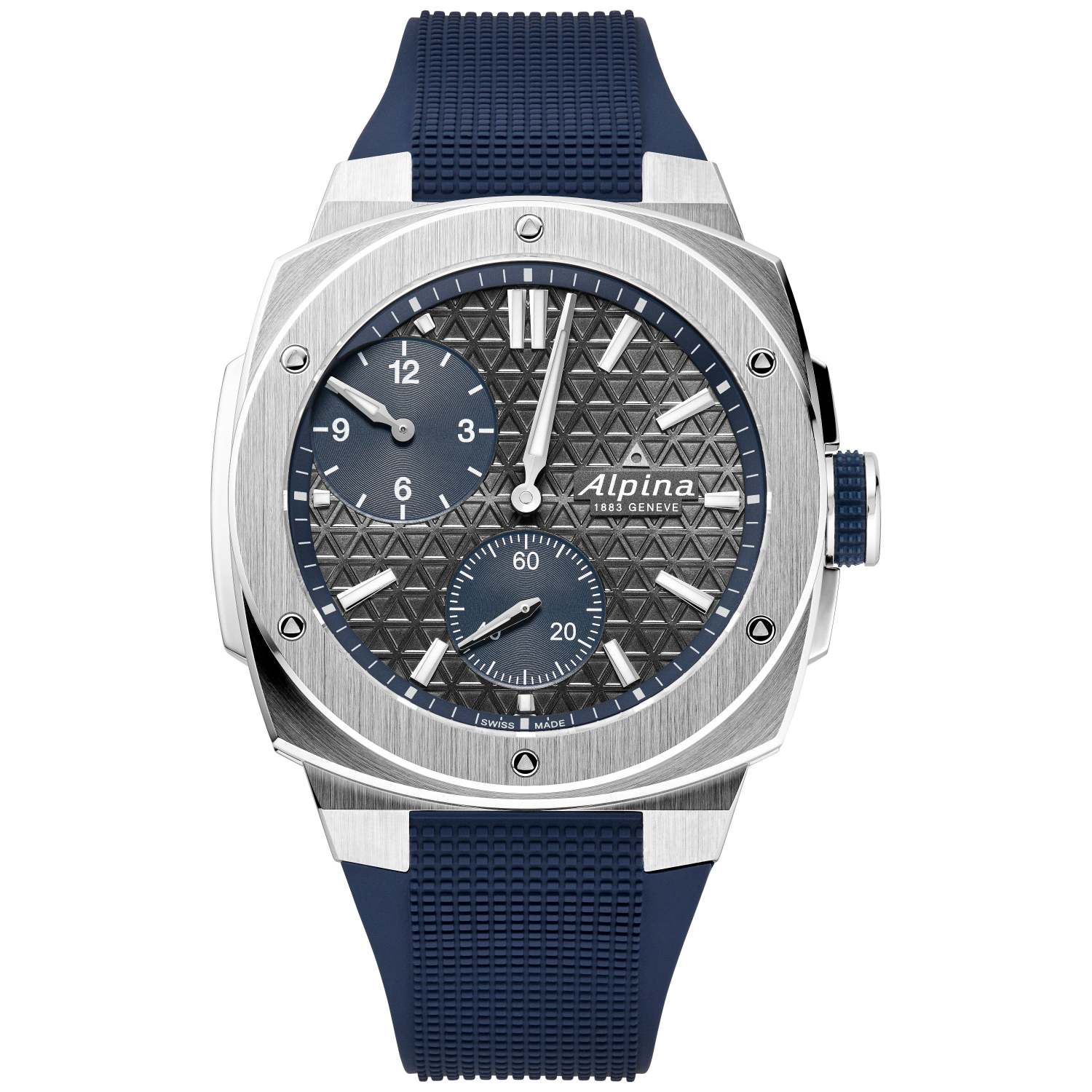 Automatic movement with 31 jewels and 38 hour power reserve. Navy rubber strap with push button folding buckle. Dark gray dial with separate display of hours minutes and seconds. Luminous stick markers and seconds hand. Navy blue hour counter at 10 position and seconds counter at 6 position. Navy outer ring with white markers. Silver-tone stainless steel bezel and see-through case back. Case thickness: 12mm. Case size: 41mm x 42.5mm. Water resistant to 200 M. 2-Year manufacturer limited warranty.