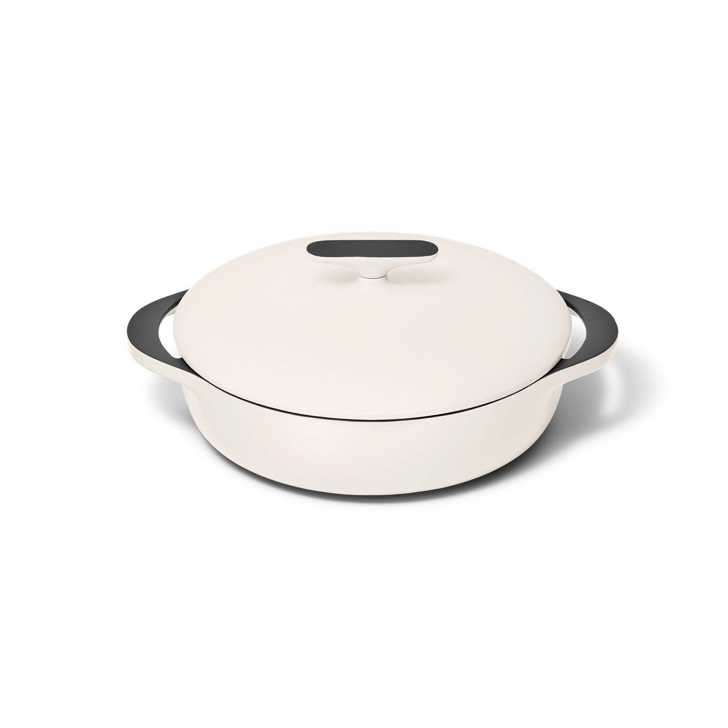Durable enamel coating gives excellent heat retention and even cooking. Enameled cast iron makes it easy to bake braise and boil. Induction gas and electric safe. Oven safe up to 500F. No seasoning required scratch-resistant and easy to clean. Non-toxic - free of PFAS PTFE and PFOA and crafted with recycled materials. 3.5qt Capacity. Dimensions: 13.2" x 10.5" x 5.1". Manufacturer limited lifetime warranty. Recommend hand wash.