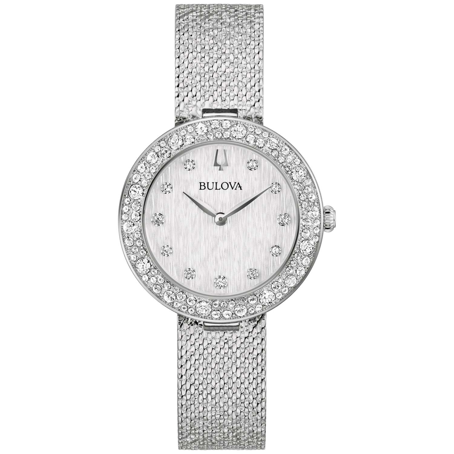 This Champagne Crystal watch offers the glitz and clam with 103 Austrian crystals. Glittering silver-tone mesh strap with adjustable sliding buckle closure. Silver-tone dial with 11 crystal hour markers and silver-tone hands. Signature silver-tone Bulova tuning fork logo at the 12 position. Bezel is fully paved with dazzling Austrian crystals. Anti-reflective sapphire crystal window is impact and shatter resistant. Quartz movement. Lug width: 14mm. Case size: 32mm. Water resistant to 30 M. 3-Year manufacturer limited warranty.