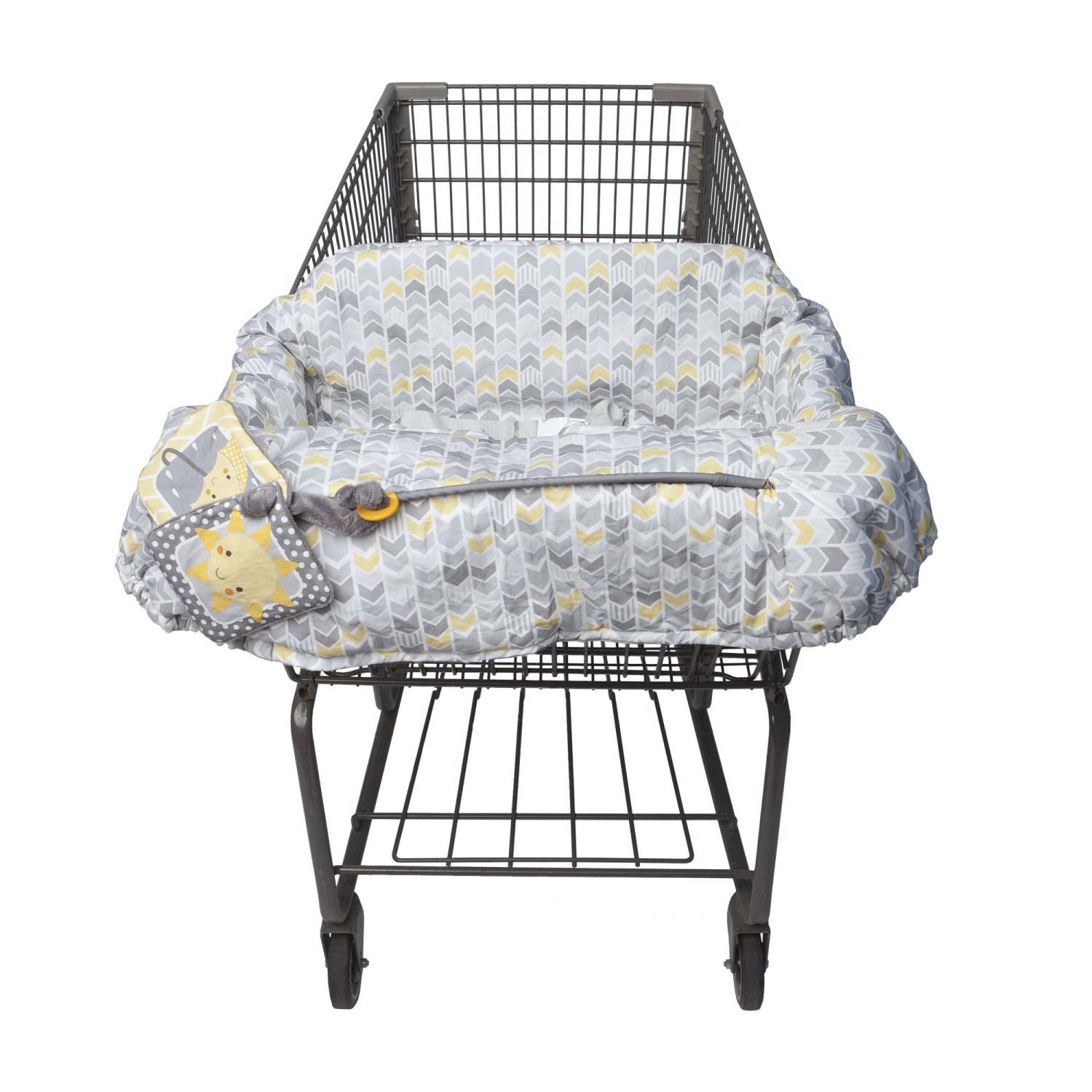 Shop worry-free with the Boppy shopping cart cover. Offers 360-degree coverage and a barrier between baby and public shopping carts. Fully padded design keep baby comfy. SlideLine toy loop runs on the front. Swap out the toy with a pacifier or favorite toy. 2-Point safety belt and elastic corners. Passes all U.S. safety standards and fits most shopping carts. Recommended ages 6 to 48 months. Cover and filling made with 100% polyester. Carrot toy made with PE foam and 100% polyester. Machine washable. Dimensions: 7.63" x 6.5" x 10.5".