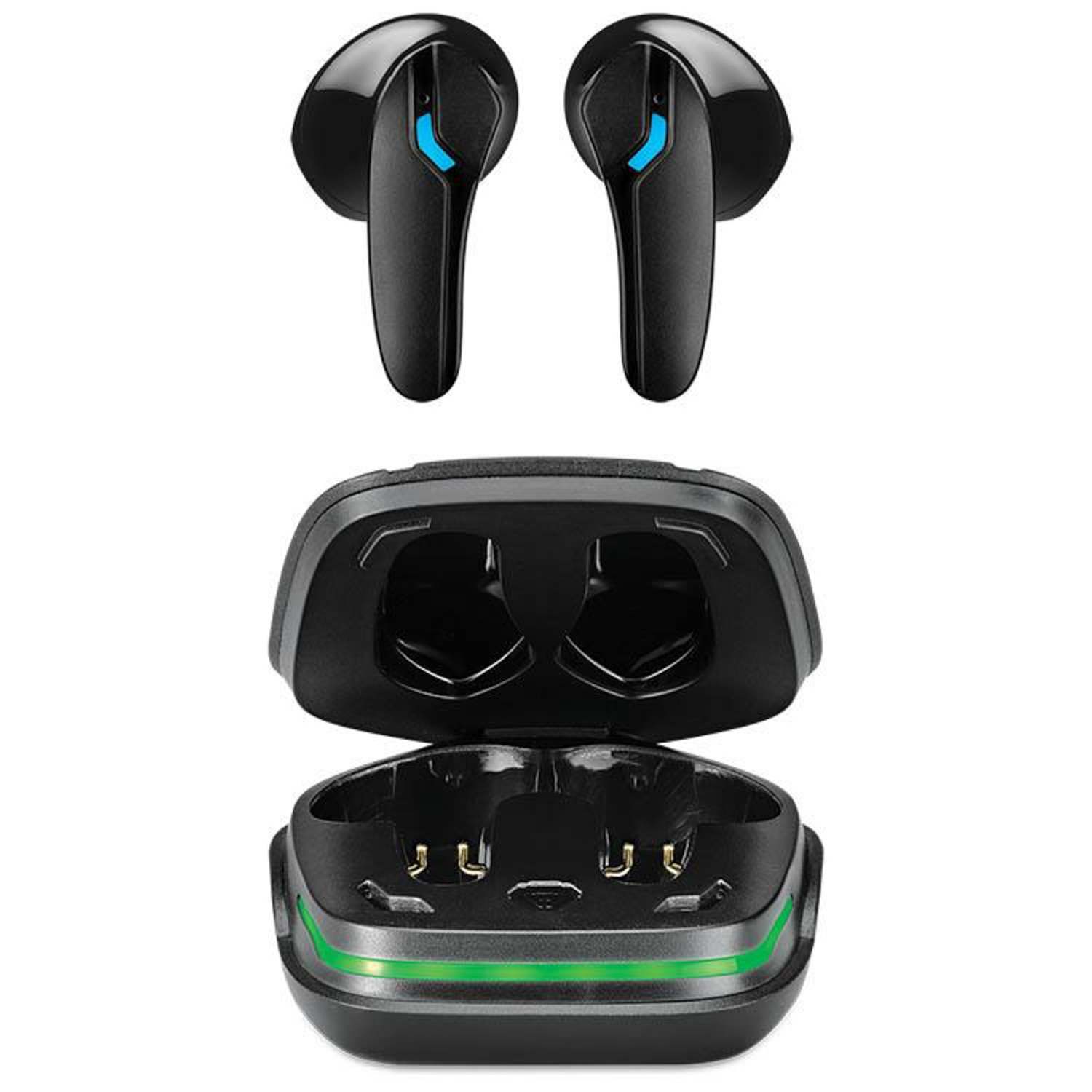 Great for gaming: PC/Mobile/Smartphone/Tablet. Supports Bluetooth v5.3. TWS - True Wireless Stereo. Environmental Noise Cancellation (ENC) for clear communication. Sweatproof. 4 Mics with ENC for optimal in-game performance. 50ms Low latency. Works with Siri and Google Assistant. 13mm Neodymium drivers. Case can recharge earbuds 1.5 times. USB-C port for battery recharge. Voice prompts. Easy pair / auto pairing. LED indicators. On-ear touch controls. Wireless range: 60 feet. Built-in rechargeable lithium ion batteries. Includes: Charging case. Charging cable.