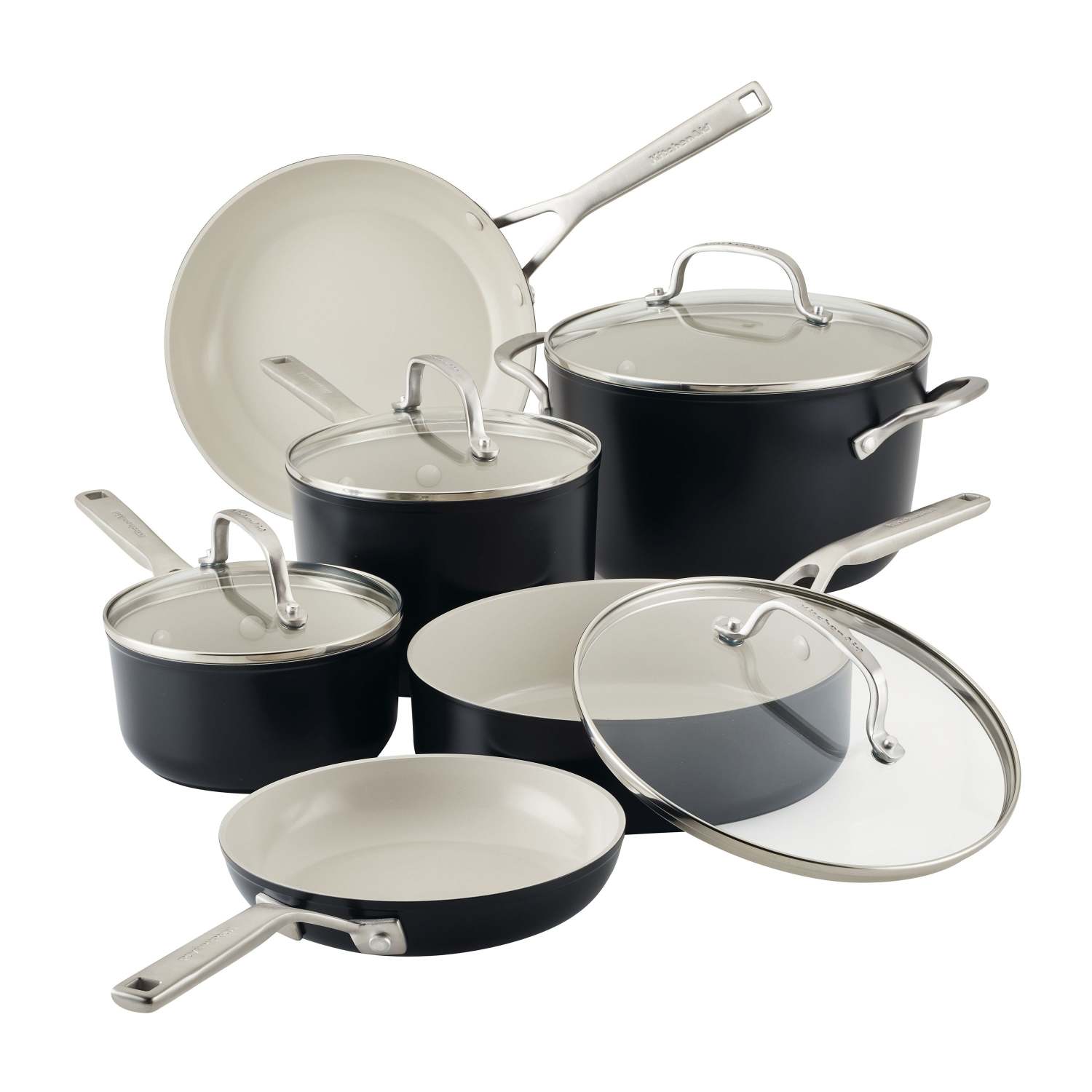 Hard anodized ceramic nonstick pots and pans are 8x harder than aluminum. Thick forged base for fast and even heat conduction. High performance ceramic nonstick is made without PFAS BPA Lead or Cadmium. Double riveted stainless steel handles provide confidence and control. Oven safe up to 500F - 350F with lid. Hand wash only. Not for induction stovetops. Includes: 8.25" Frying pan. 10" Frying pan. 1.5qt Saucepan with lid. 3qt Saucepan with lid. 3qt Saute pan with lid. 6qt Stockpot with lid.
