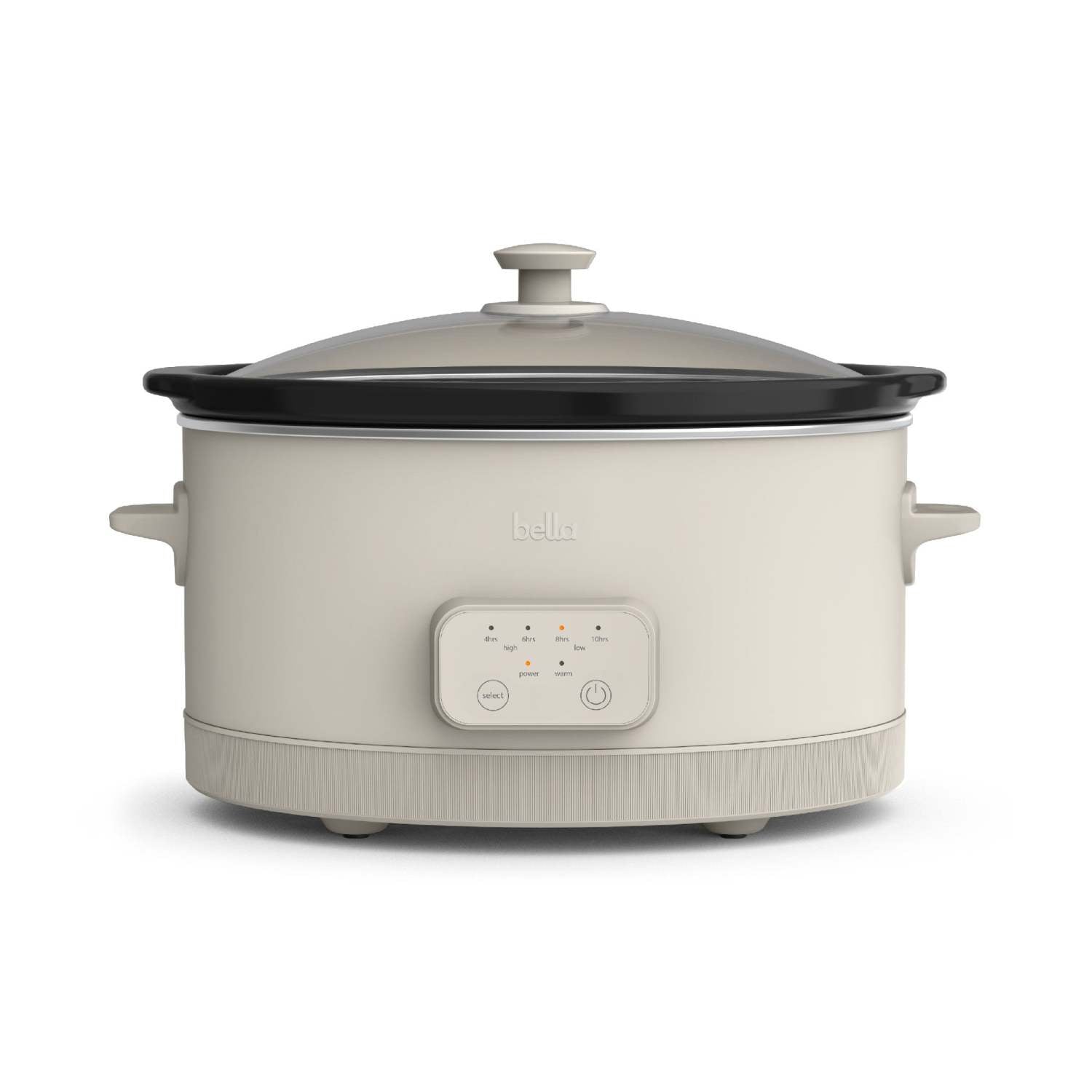 6qt Capacity slow cooker is perfect for cooking big batches of soups chili and stew. Four programmable presets include 4 6 8 and 10 hour cook times. Once cook time is up slow cooker will switch to a warm setting until youre ready to serve. Durable shatter-resistant glass lid. Cool-touch handles intuitive touch-activated displays and non-skid feet. No more tangled mess"cord neatly tucks away. Uses a 12V AC electrical wall outlet. Stoneware pot and glass lid are dishwasher safe. Dimensions: 9.98"H x 15.9"W x 11.31"D.