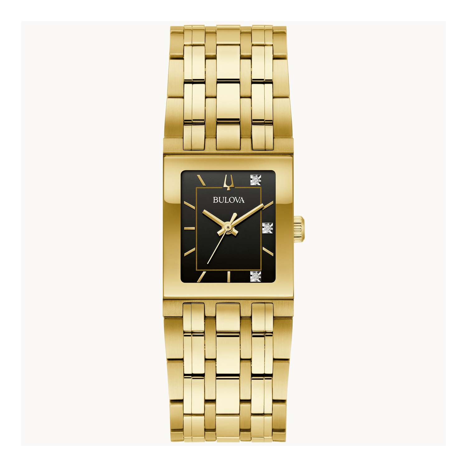 This Quadra watch draws details from the style of legendary performer Marc Anthony. Gold-tone stainless steel multilink bracelet bezel and case. Black rectangle dial with 3 diamond and gold-tone hour markers. Signature gold-tone Bulova tuning fork logo at the 12 position. Three gold-tone hands. Metalized curved mineral crystal dial window. Quartz movement achieves accuracy to 15 seconds a month. Double push button fold over deployant closure. Lug width: 21mm. Case size: 21mm. Water resistant to 30 M. c