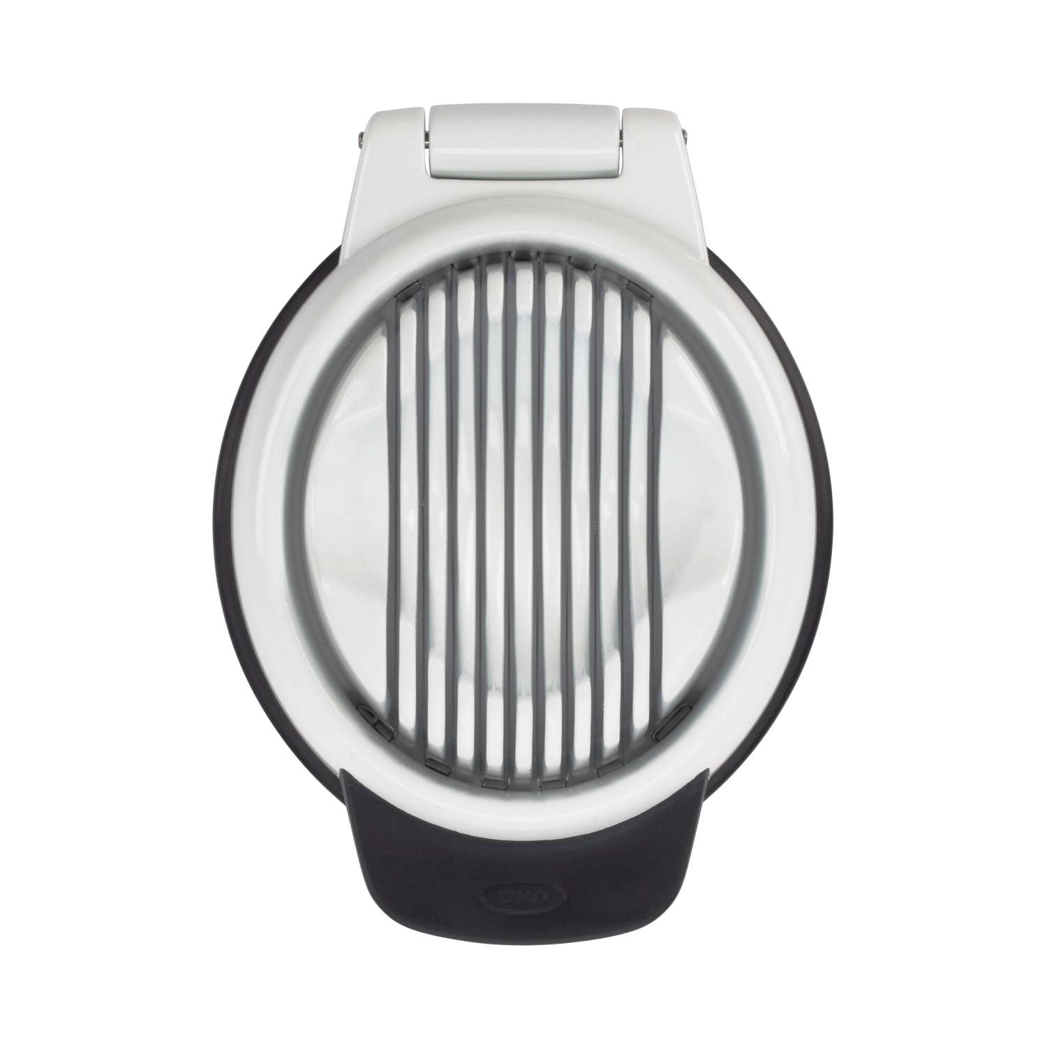 Cuts hard-boiled eggs in 5mm slices. Holder cradles egg for round or oblong slices. Raised handle to open and close. Non-slip base provides comfy grip. Top-rack dishwasher safe.