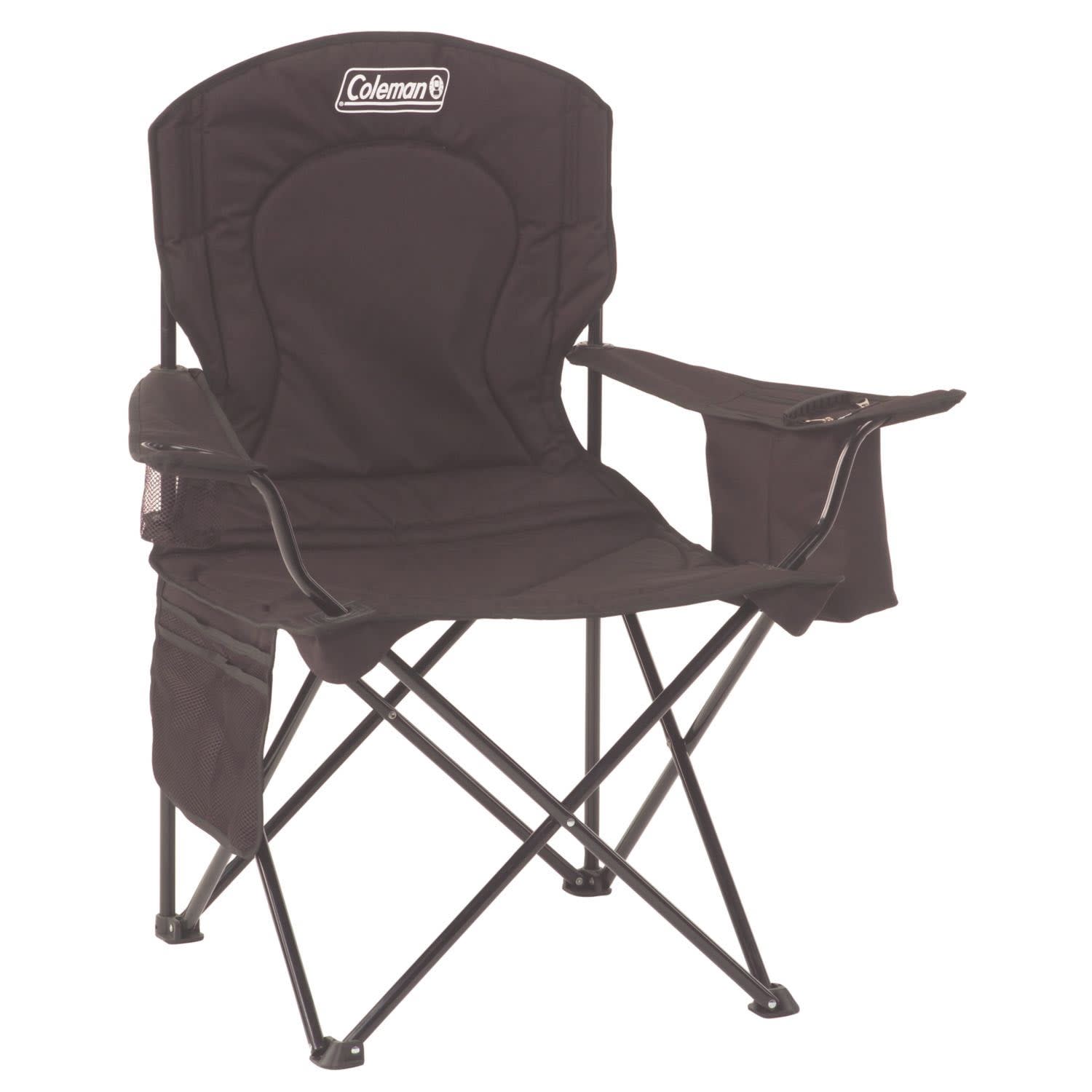 Powder-coated steel frame provides durability. Poly oxford double weave seat. Cooler built-into sidearm holds up to 4 cans. Side storage pocket. Comfortable head cushion. Convenient cup holder. Easily folds up for compact storage. Supports up to 325lbs. Comes with carry bag. Roomy 24" seat and 18.1" sitting height.