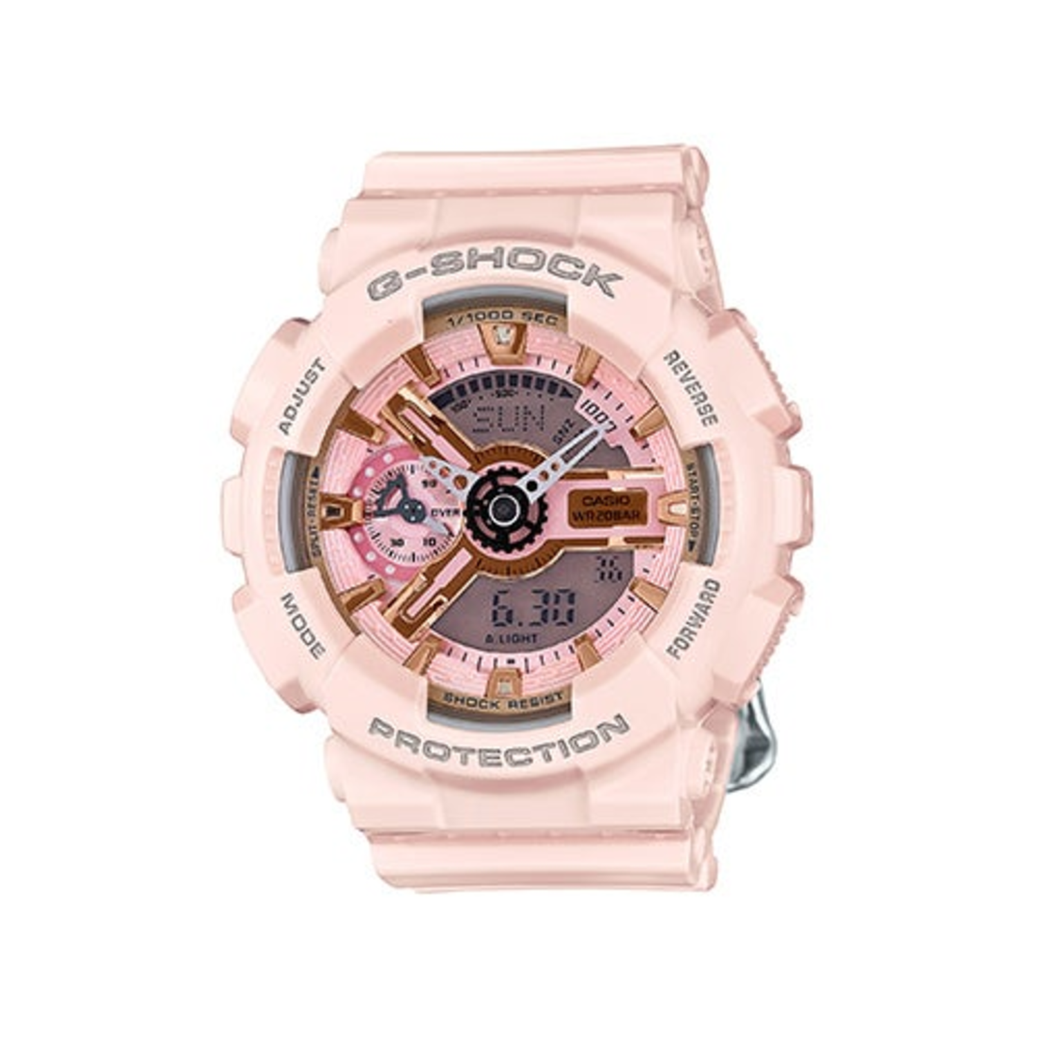 Matte baby pink resin watch and case. Analog and Digital dial with silver-tone hands and metallic pink hour markers. Auto LED light wither afterglow. World time: 29 time zones (48 cities + UTC). City code display. Daylight saving on/off. 5 Daily alarms - 1 with Snooze. Hourly time signal. 1/1000 Second stopwatch with speed indicator. Countdown timer. 12/24 Hour formats. Shock and Magnetic resistant. Water resistant to 200 M. Accuracy: +/- 15 seconds per month. Case size: 49mm x 45.9mm x 15.8mm.