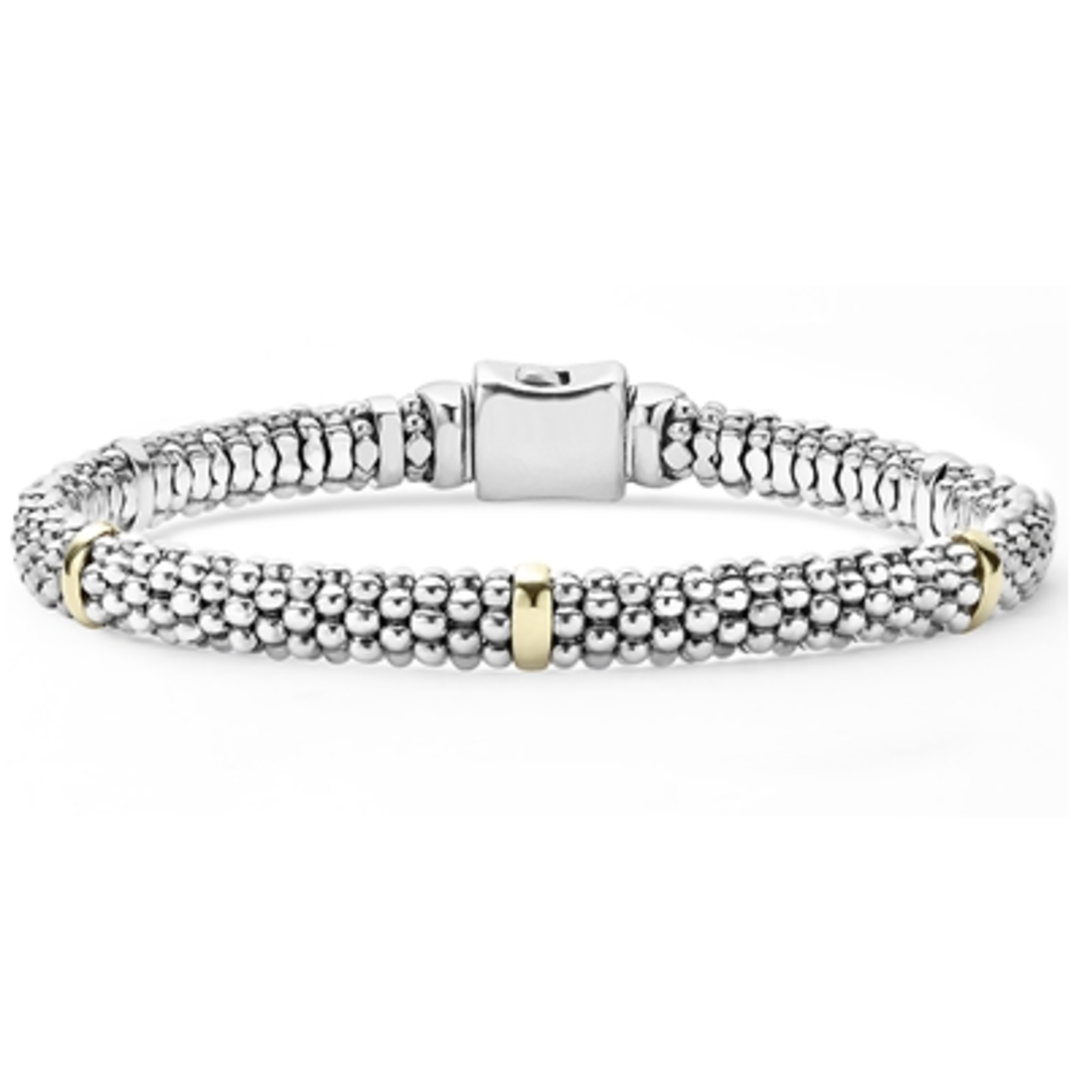 A classic oval bracelet featuring five 18K gold stations and signature sterling silver Caviar beading, finished with a box clasp that displays the LAGOS crest. Sterling Silver, 18K Gold, Box Clasp, Rope Width 6mm
