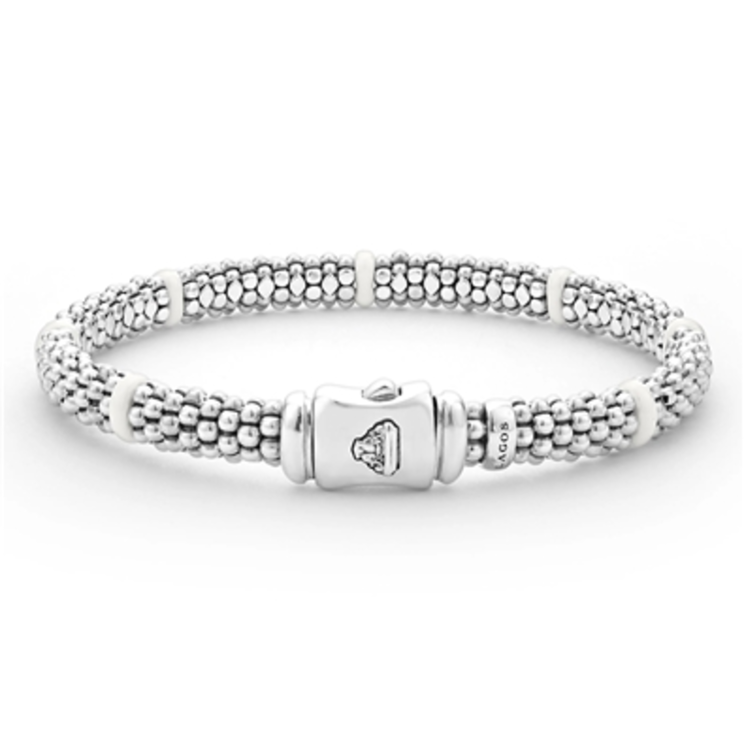 This signature bracelet showcases a striking design featuring seven smooth white ceramic stations, each accented by intricate sterling silver Caviar beading. The combination of gleaming ceramic and textured silver creates a timeless contrast, while the sterling silver rope, measuring 6mm in width, adds bold elegance. Secured with a single presser clasp, this piece blends modern sophistication with classic craftsmanship for a truly refined accessory.