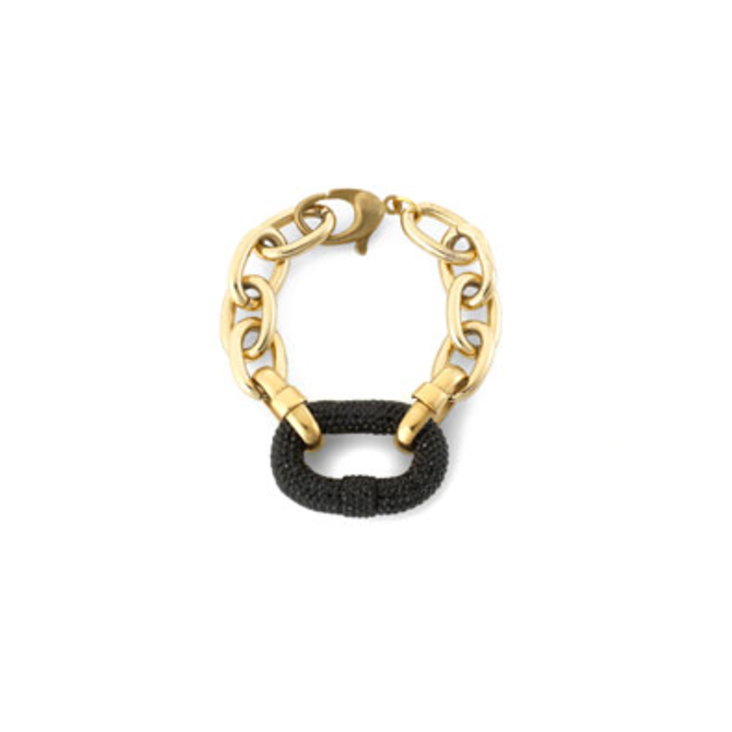 Juan Carlos Obando collaborated with Atelier Swarovski to create collections for the Spring/Summer 2014 line featured alongside the core collection. This sophisticated and timeless collection transitions effortlessly from day to evening. The LA-based designer re-created his chain link accessories into statement pieces with a whole lot of Swarovski bling. Timeless style. Black Swarovski crystals add elegance to this otherwise classic chain link bracelet from Atelier Swarovski by Juan Carlos Obando.