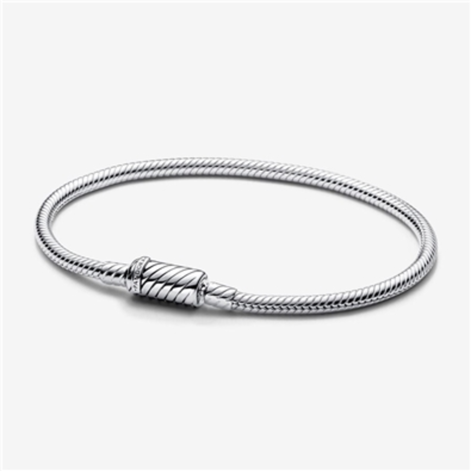 Meet the Pandora Moments Sliding Magnetic Clasp Snake Chain Bracelet. Our sterling silver snake chain bracelet gets an update with a new magnetic clasp, making it even easier to put on and style with your favourite charms. The magnetic clasp clicks shut with ease, and a sliding piece holds it securely in place. The snake chain texture continues on the clasp for a sleek, streamlined look. Style it with up to 16-18 Pandora Moments charms or dangle charms.
