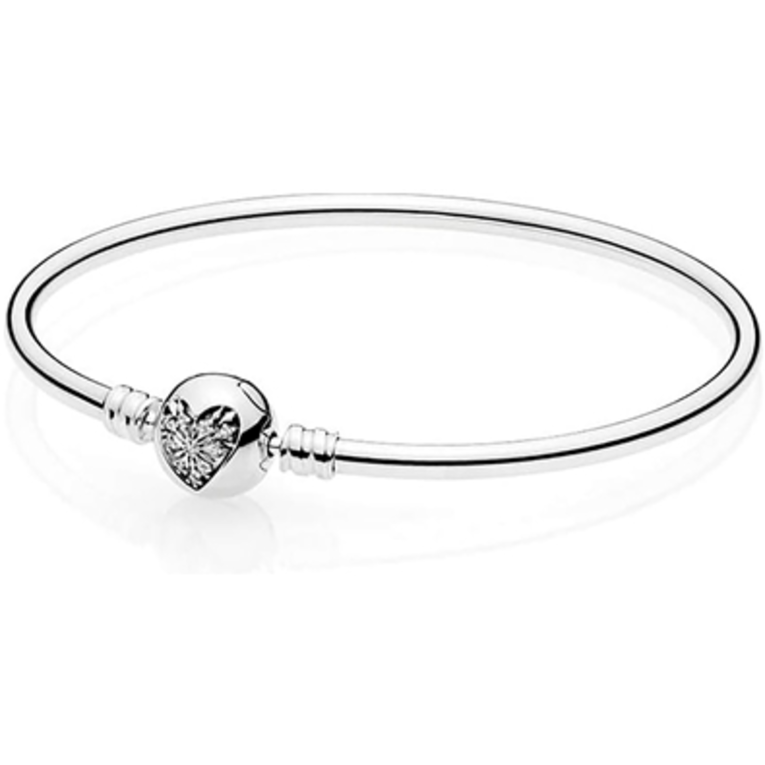 A stunning silver bangle with a snowflake heart featured on the clasp. Sparkle like the freshly fallen snow with this hand finished, sterling silver bangle. This piece makes a beautiful gift for the Pandora lover in your life that they can customize with Pandora charms to tell their story.