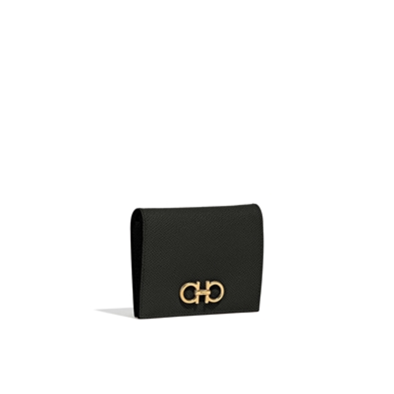 Compact, elegant, and functional, this French wallet is made of hammered calfskin leather with a fine grainy texture. The signature Gancini buckle in an antique gold hue adds a striking touch of lux, while the neatly organized interior has bill compartments, slit pockets, and card slots, plus a practical coin pocket with a snap button closure. Composition: Hammered Calfskin.