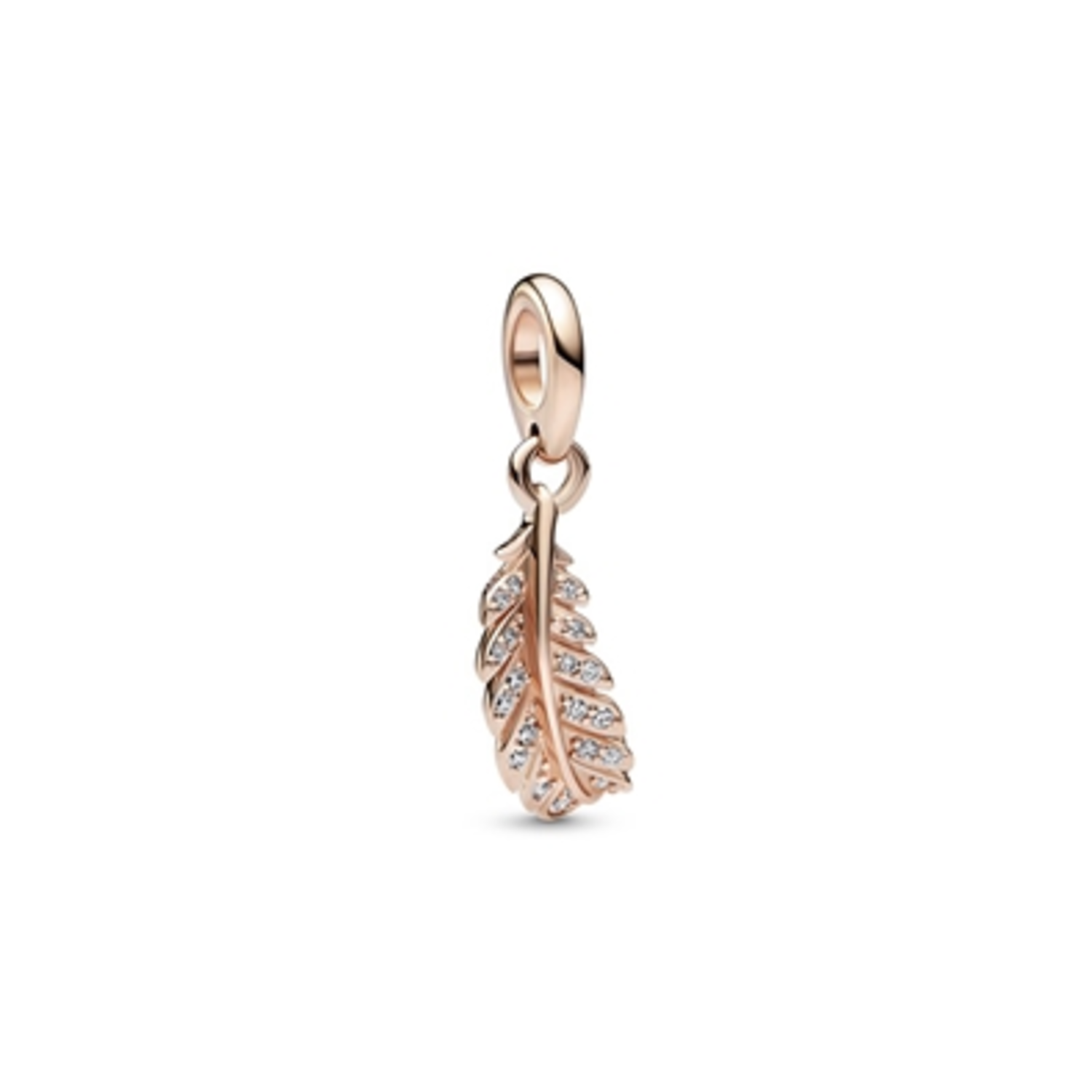 Catch the season's light with our Floating Curved Feather Dangle Charm. This 14k rose gold-plated dangle charm features a feather curved to look like it is suspended in the air, delicately falling to the ground. The front of the feather is set with round brilliant-cut clear cubic zirconia following its whimsical shape. Style it with other 14k rose gold-plated pieces to enhance your spring glow.