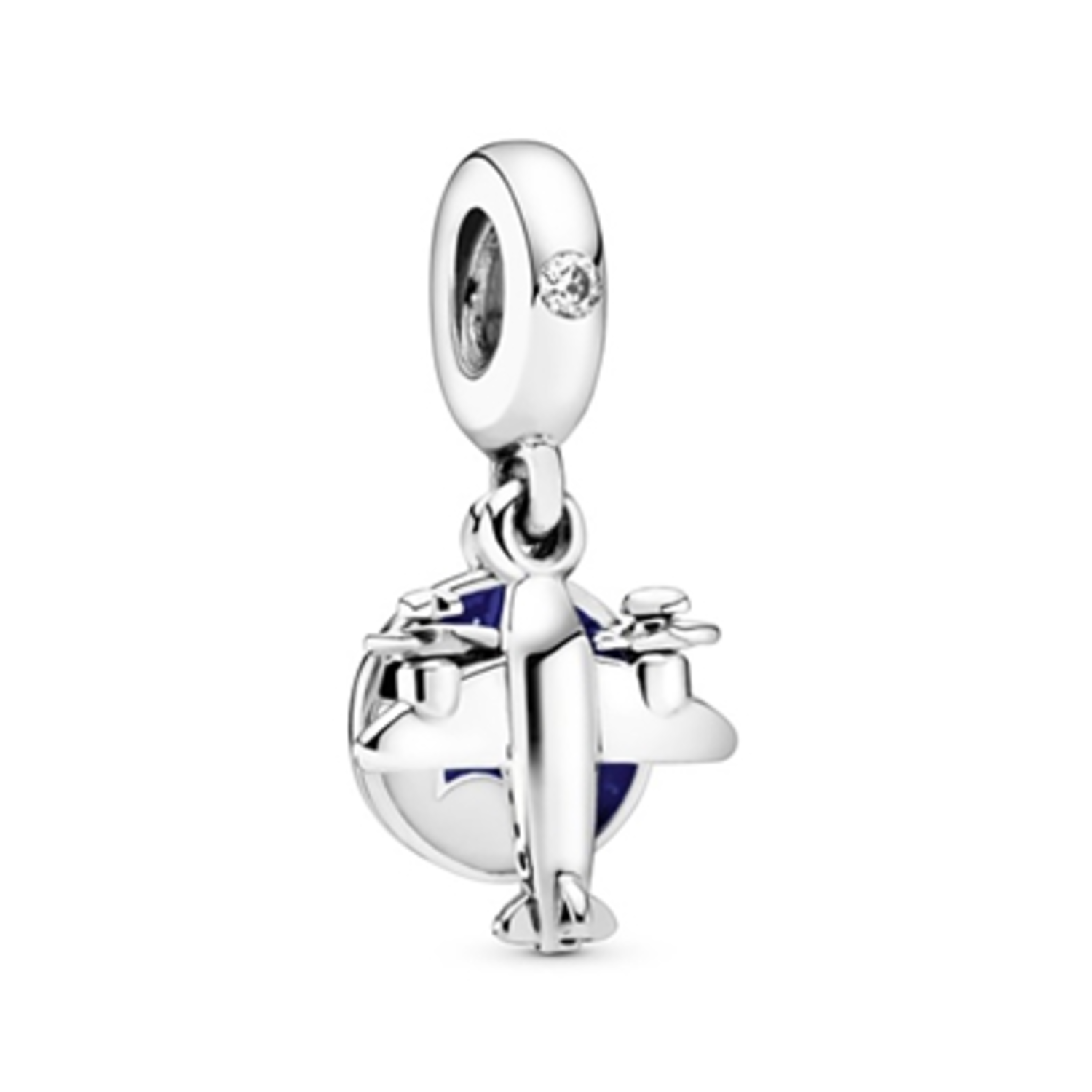 Take your style to new heights with this travel-inspired dangle charm, hand-finished in sterling silver. Made to be worn on our Pandora Moments charm bracelets and bangles, it's shaped as an aeroplane and detailed with miniature propellers. The disc is decorated with hand-applied blue and white enamel and engraved with the words "To travel is to live". Wear yours as a reminder of your favorite trip