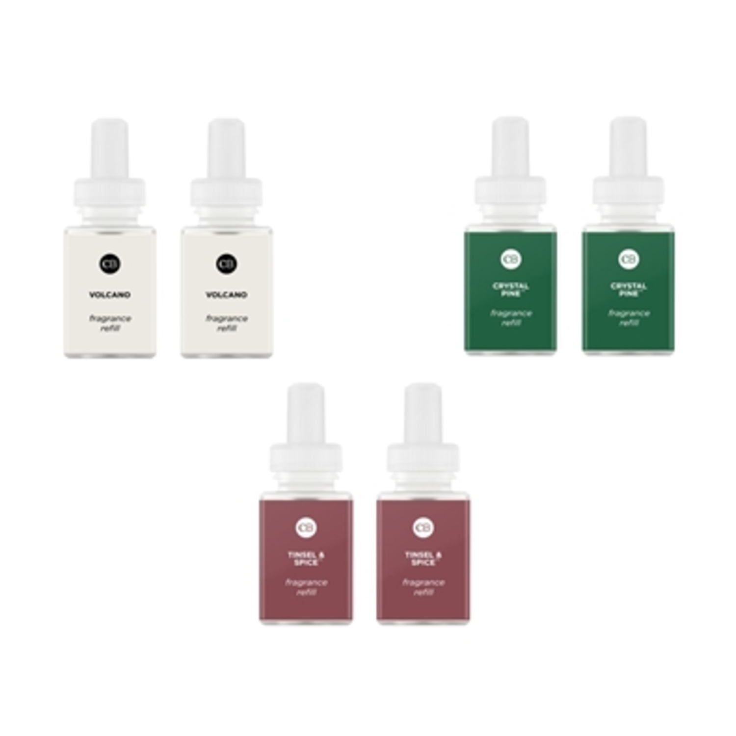 This Kit contains: 2 Crystal Pine, home fragrance – glistening pine, fragrant sage, and frosted fir blended elegantly with snowy woods; 2 Tinsel and Spice, home fragrance – juniper berry and orange mandarin blended with heart notes of cinnamon and clove, leaving base notes of creamy vanilla and forest woods; and 2 Holiday Volcano, home fragrance – exotic citrus, vanilla, and tropical notes.