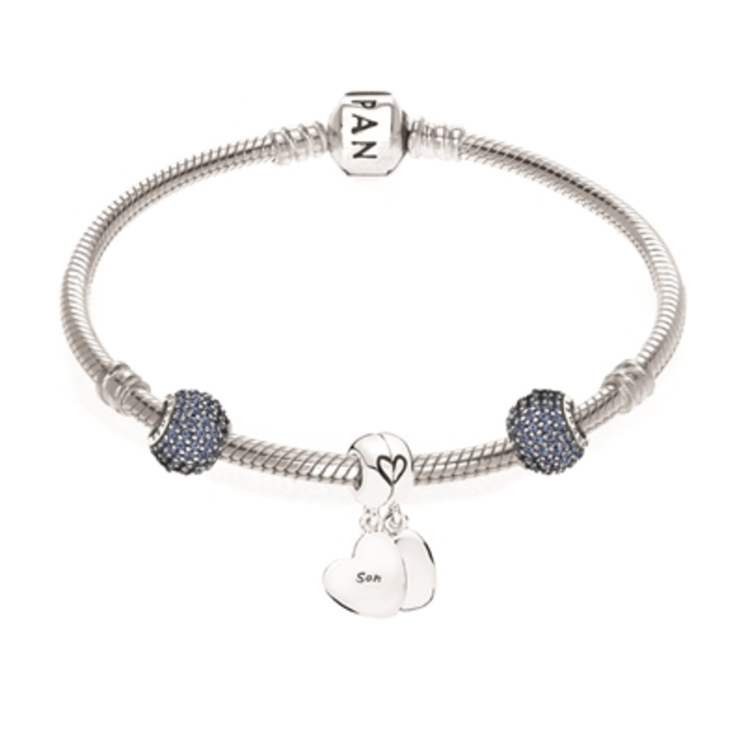 Pandora presents the Loving Son bracelet. The bracelet features 2 Blue Pave Light, 1 Mother Son Heart, on the classic sterling silver bracelet.