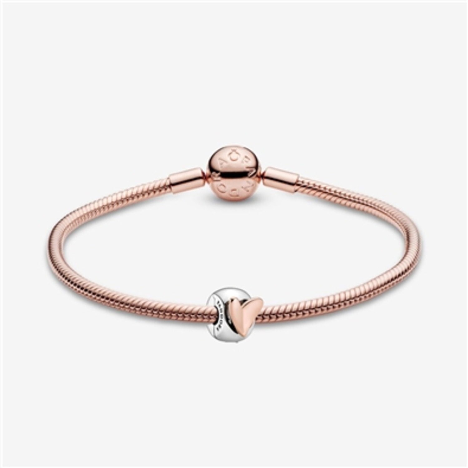 Pandora presents the beautiful Floating Heart Bracelet featuring 1 Freehand Heart Clip Charm on the Rose Moments Snake Chain Bracelet.