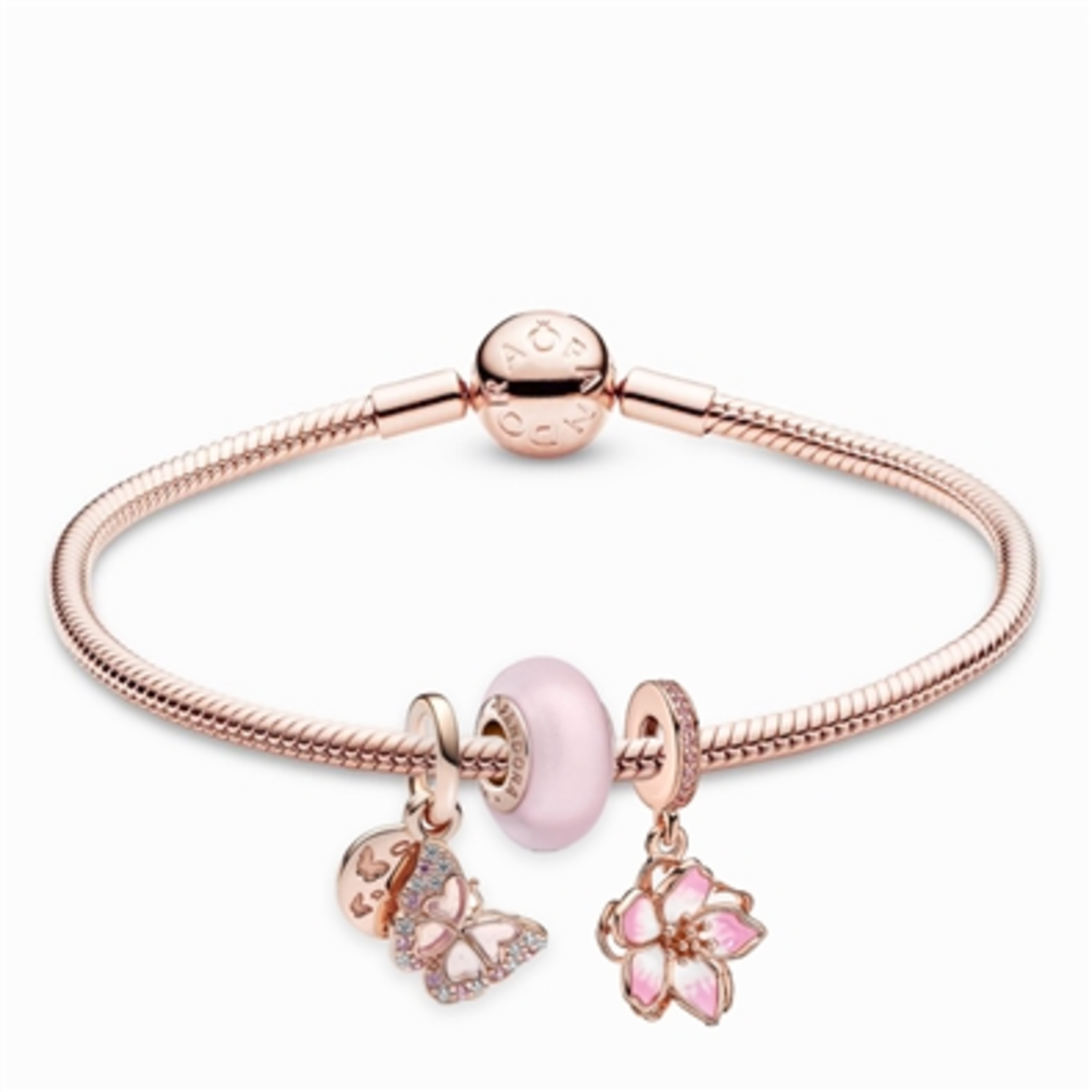 This bracelet on the rose gold bracelet evokes images of peaceful gardens and the cherry blossom season. With a dangling cherry blossom, a delicate butterfly, and a soft pink murano charm, this feminine bracelet will be well-loved by its wearer for its tranquil inspiration and feminine design.