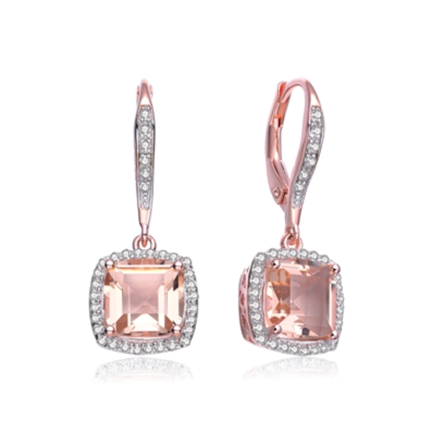 Classy sterling silver two tone leverback drop earrings. These earrings are adorned with large asscher cubic zirconia stones, accented by small clear round cubic zirconia stones paved on the metal frame and the front part of the leverback. Crafted of sterling silver with rhodium and rose gold plating and secured with a leverback.