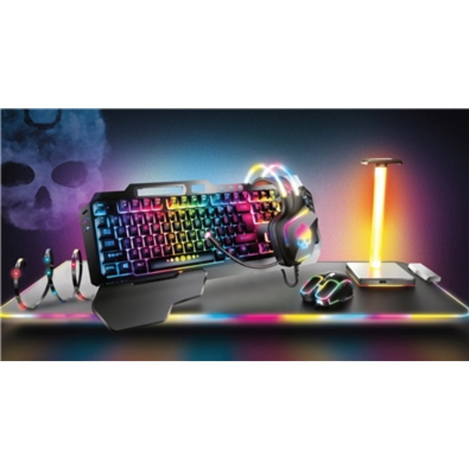The 6-in-1 Gaming Combo offers a complete setup for gamers seeking performance, comfort, and style. The RGB Keyboard features a built-in wrist rest and metal frame, complete with a volume knob and multimedia keys for easy control. With a 16.8 million RGB color spectrum and integrated mounts for a smartphone and stylus, this keyboard takes your gaming experience to the next level. The Optical RGB Mouse offers up to 7200 DPI with seven buttons, including DPI adjustments and back/forward controls, each with its own RGB effect. Its braided cable ensures tangle-free use and enhanced durability. The Micro Woven RGB Mousepad (32" x 12") is designed for smoother accuracy, with four USB ports that double as a charging hub while keeping your workspace clutter-free. The 'Max Comfort' RGB Headset features a flexible, ro-grade microphone, padded, sweat-resistant ear cups, and 50mm audio drivers that deliver crystal-clear sound with enhanced bass for an immersive gaming experience. The Anti-Slip RGB Headset Stand not only provides a stable, space-saving storage option for your headset but also lights up for an ambient, mood-enhancing effect. Completing the set, the 3ft RGB Light Strip reduces eye strain while gaming at night, with easy installation and a long battery life of up to 50,000 hours. This combo combines essential features and vibrant RGB lighting for the ultimate gaming setup.