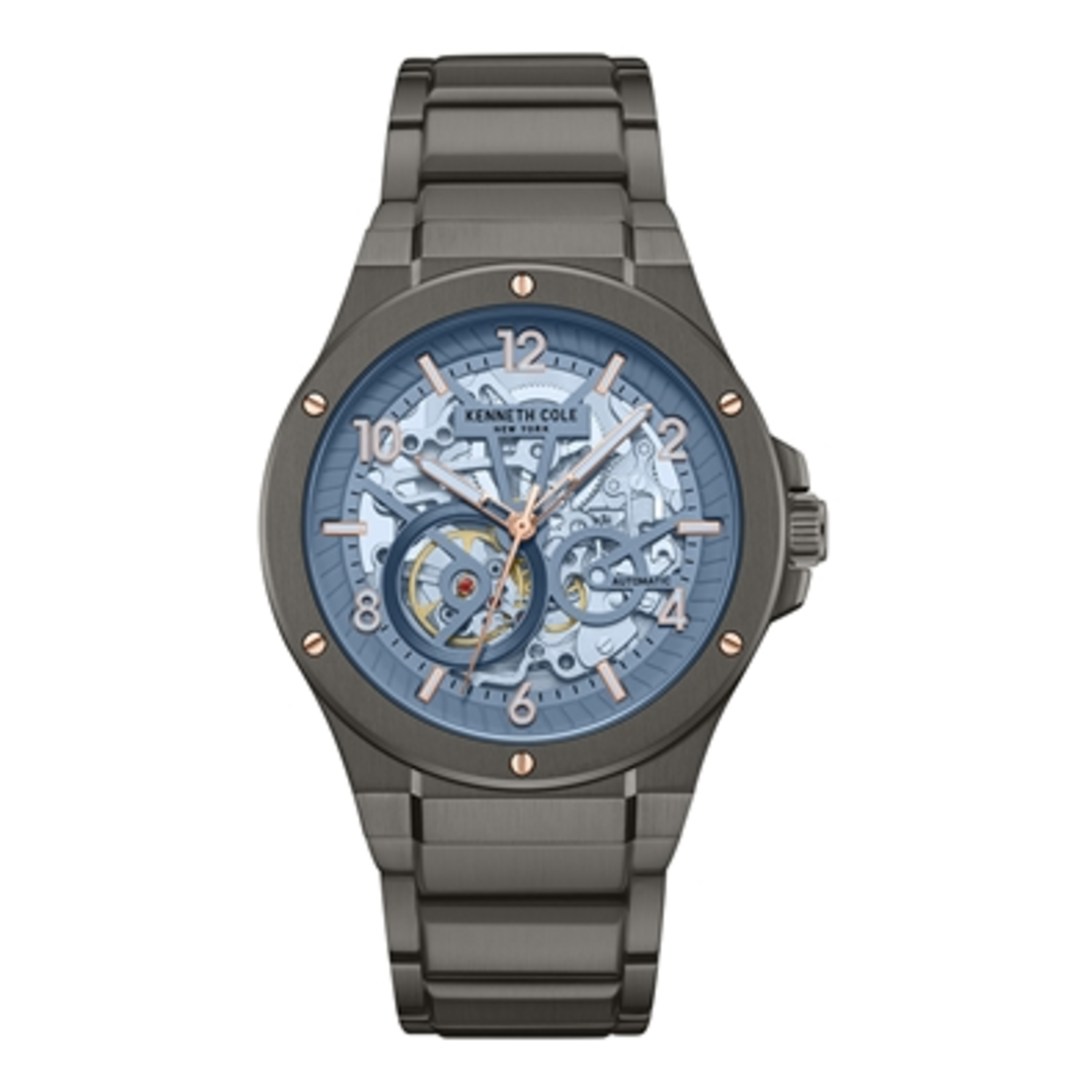 The latest automatic watch from Kenneth Cole New York makes a striking statement of modern masculinity with the brand's signature DNA, this timepiece masterfully combines form and function. Beneath a flat, blue-tinged glass, the grey patterned dial reveals a mesmerizing view of its intricate inner workings. The screwed details on the top ring bring an undeniable touch of rugged sophistication. With every tick, it stands as a testament to refined taste and contemporary urban style.