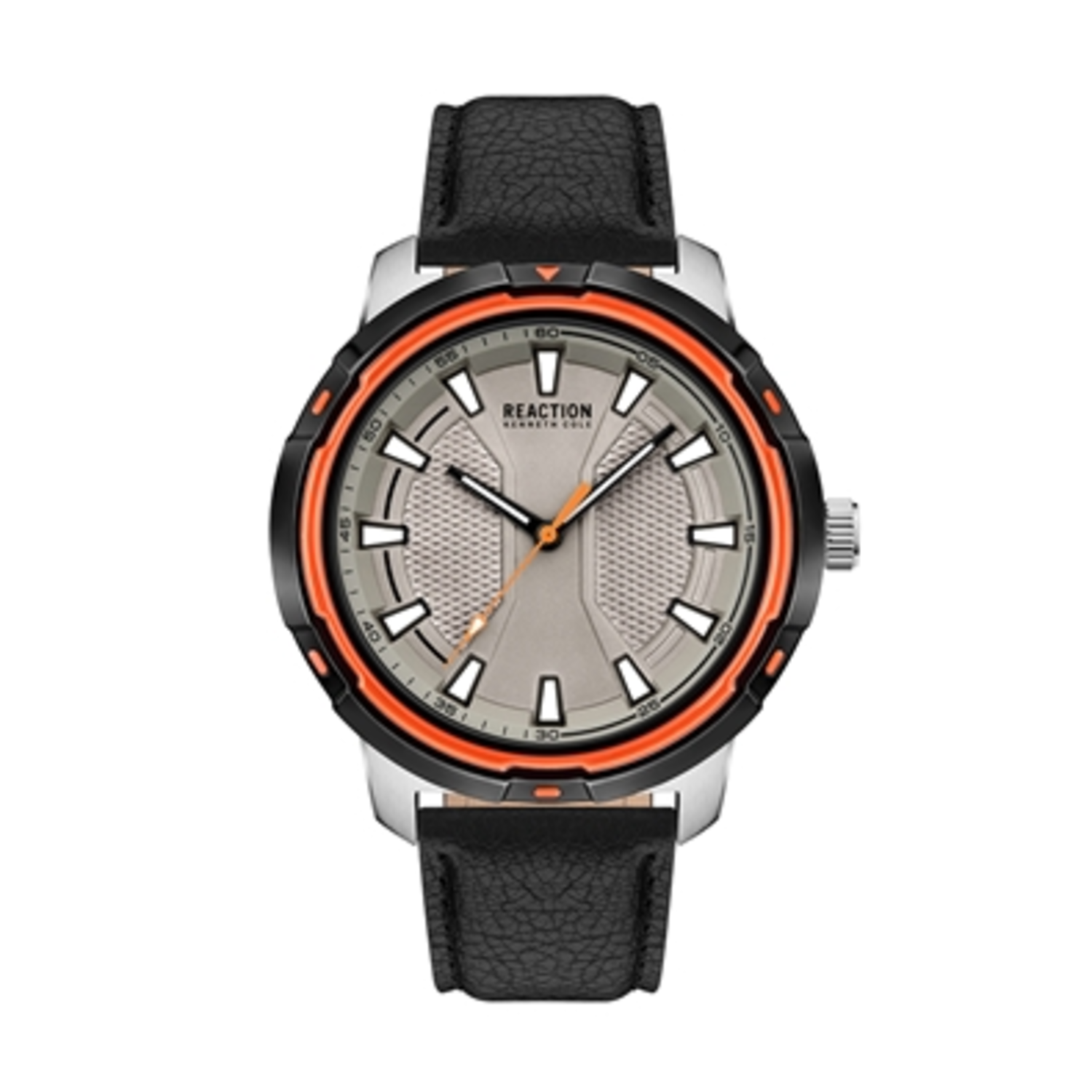 Kenneth Cole Reaction men's three-hand quartz analog watch features a two tone silver and black 44mm case accented with an orange bezel. The warm grey dial is accented with black hour markers. The watch is completed with a black strap.