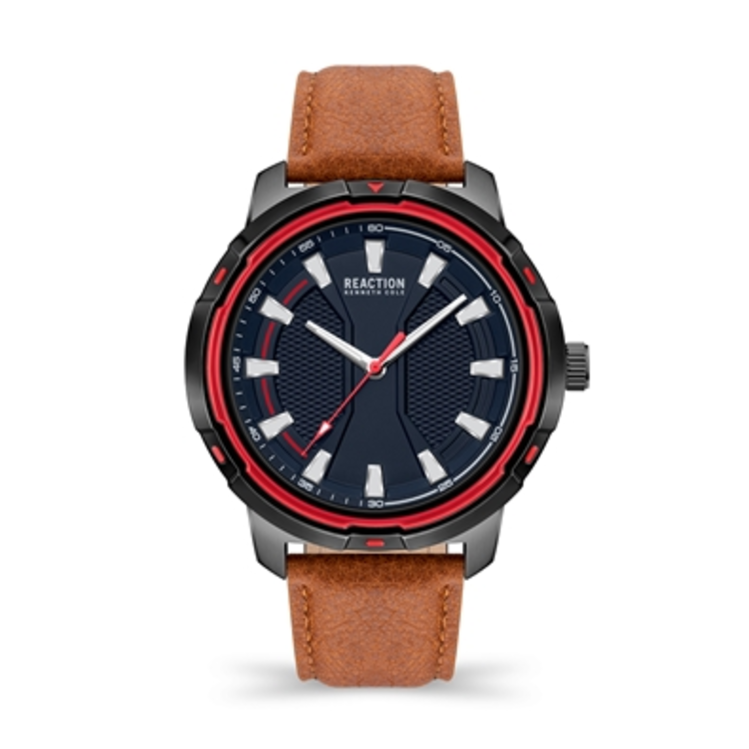 Kenneth Cole Reaction men's three-hand quartz analog watch features a two tone gunmetal and black 44mm case accented with a red bezel. The blue dial is accented with white hour markers. The watch is completed with a tan strap.